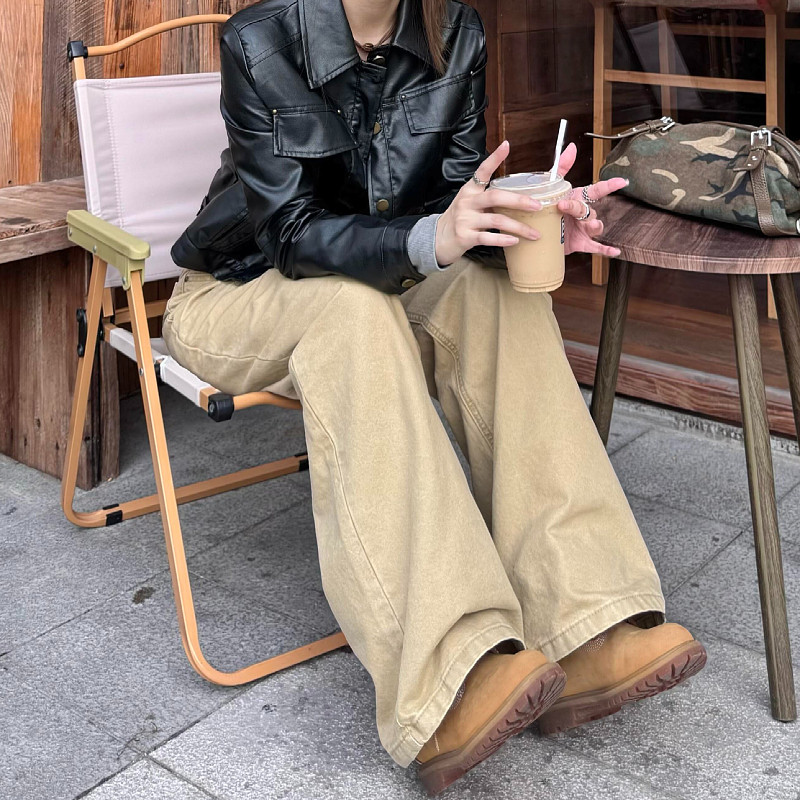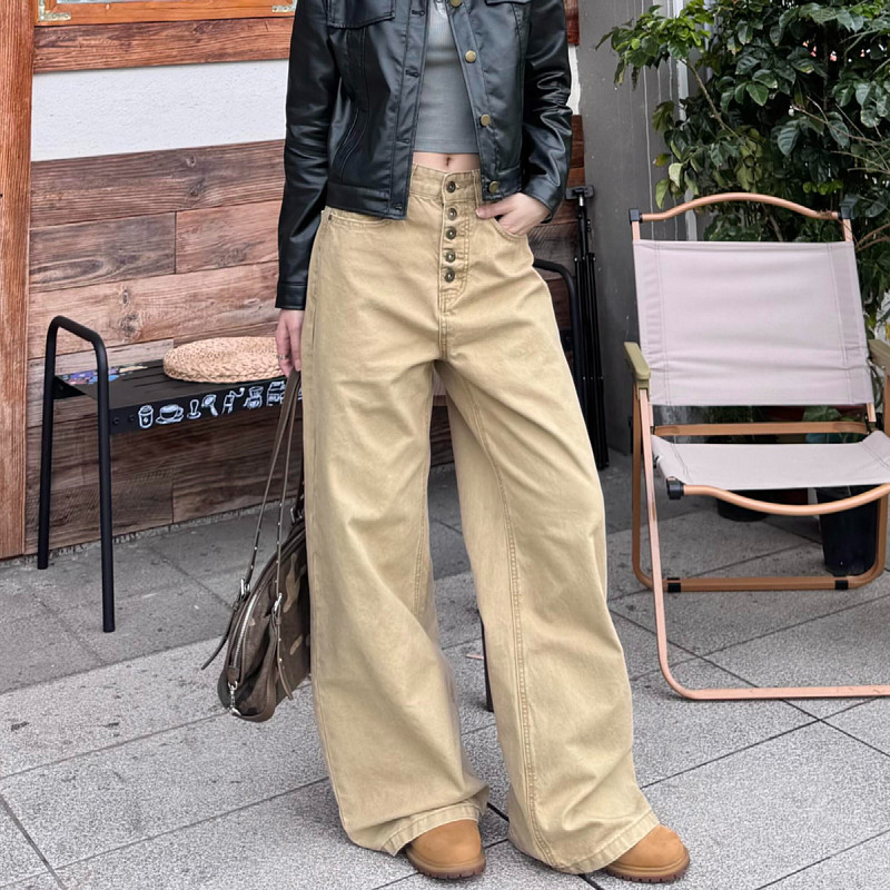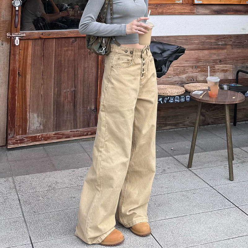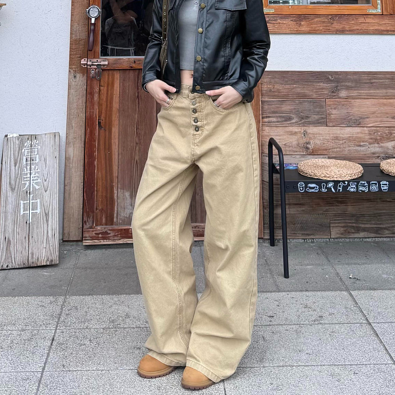 大码美式复古直筒宽松排扣工装牛仔裤男女可调节设计感阔腿长裤潮