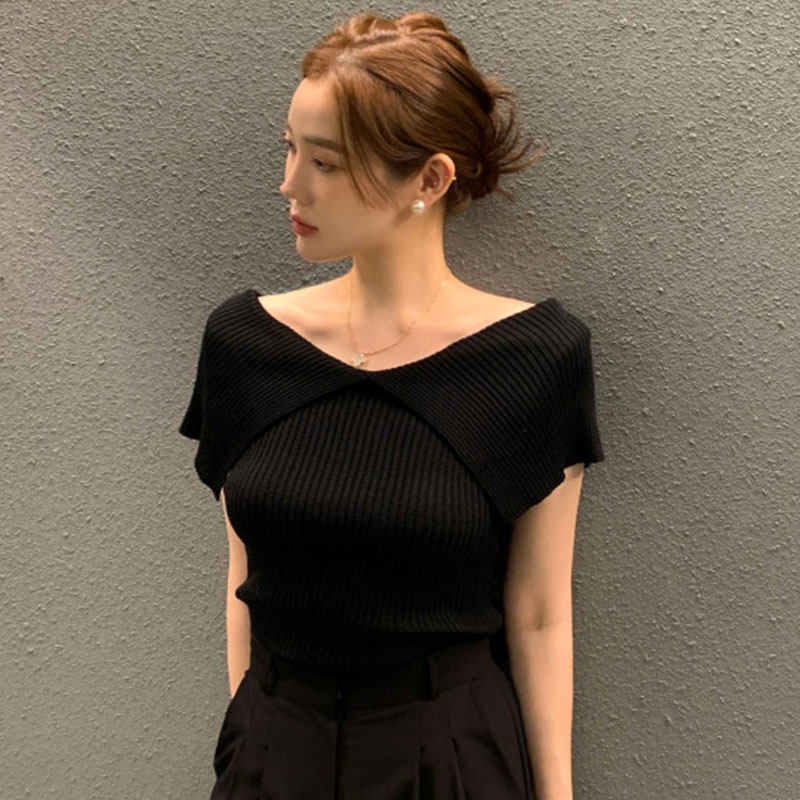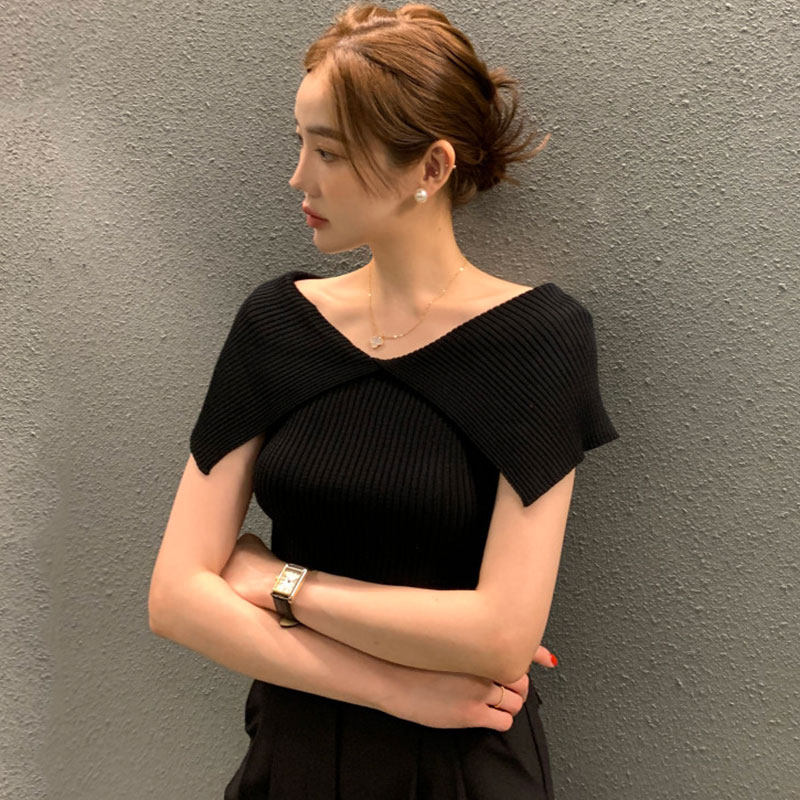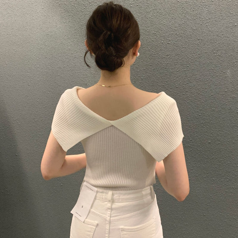 韩国chic夏季温柔气质翻领正反两穿弹力修身显瘦短袖套头针织衫女