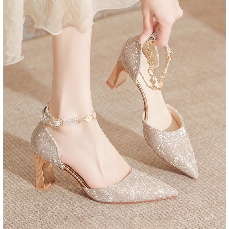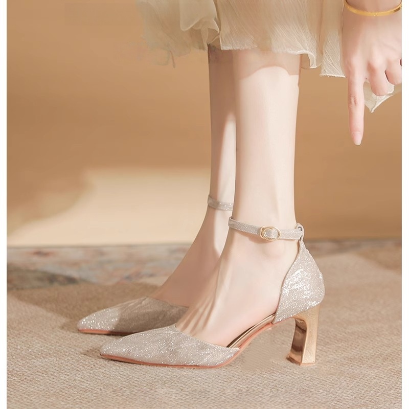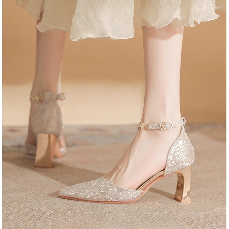 法式绝美高跟鞋女2025新款主婚纱新娘鞋一字扣带配裙子粗跟凉鞋女