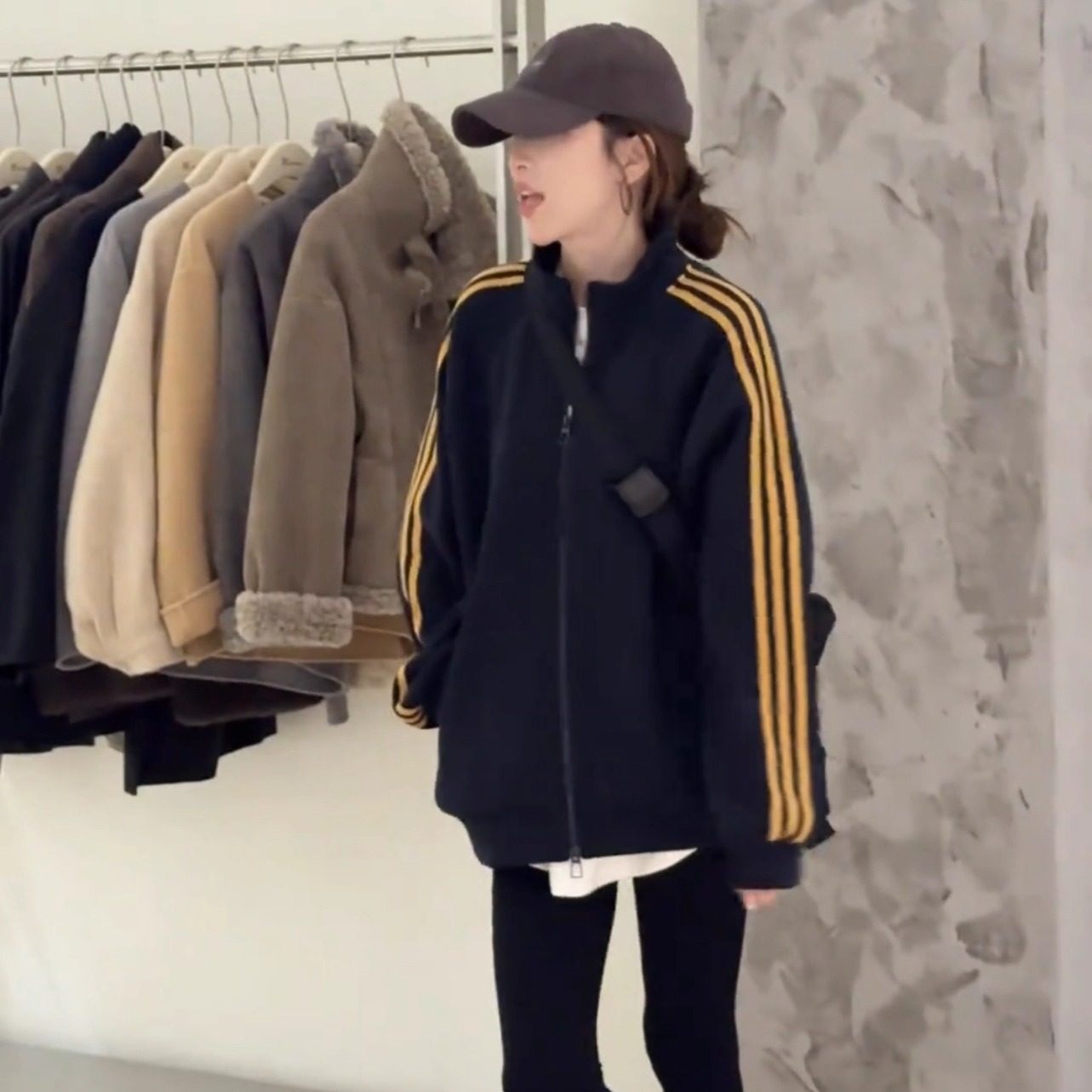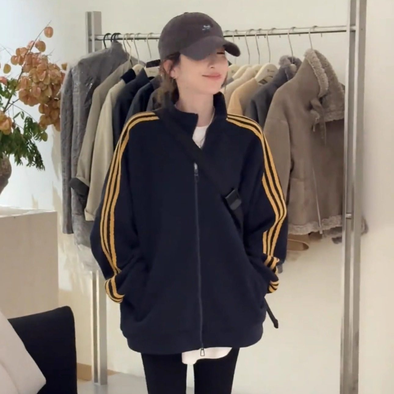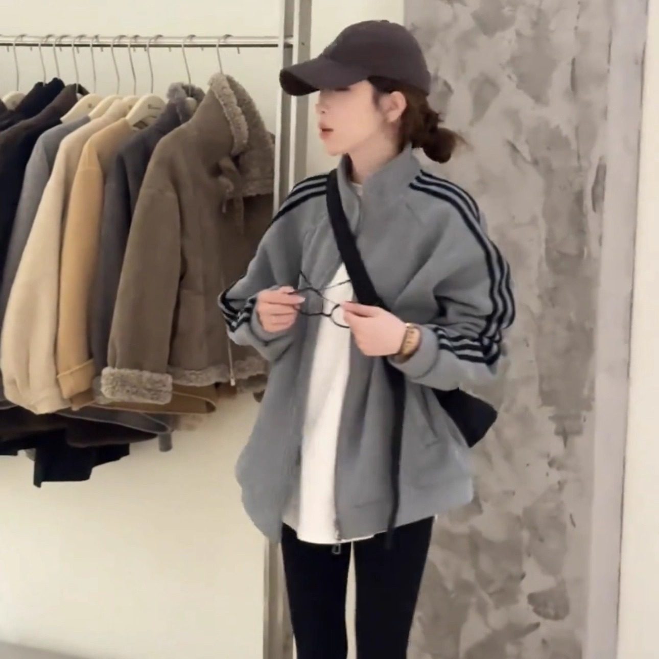绒加厚三条杠加外套女秋冬季新款休闲时尚卫衣韩版宽松棒球服上衣