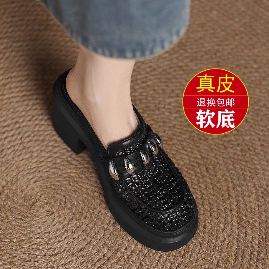 头层牛皮洋气外穿包头凉拖鞋小个子高跟时尚编织镂空厚底粗跟凉拖