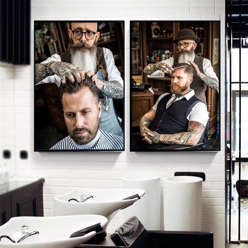 复古美发店装饰画理发店发廊背景墙面挂画barbershop发型海报壁画