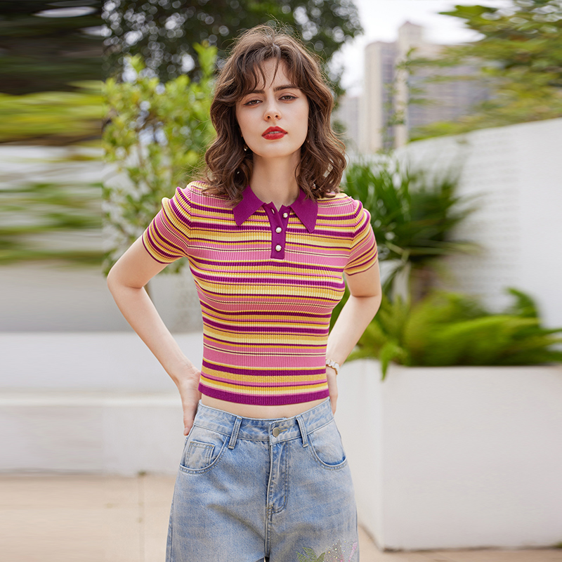 白鹿语翻领撞色条纹短袖针织衫