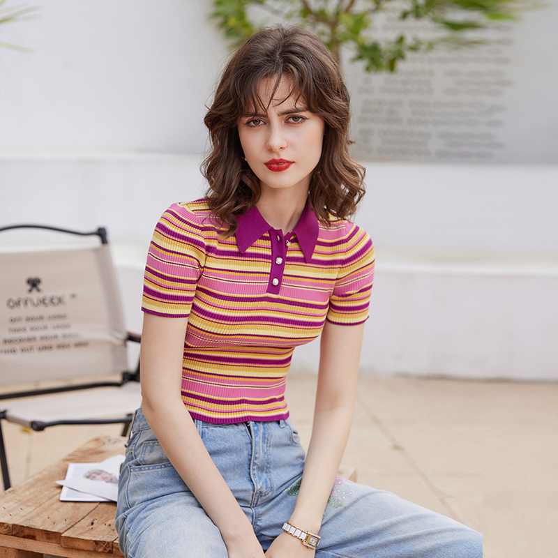 白鹿语减龄polo翻领条纹上衣2025夏款文艺套头修身短袖女式针织衫