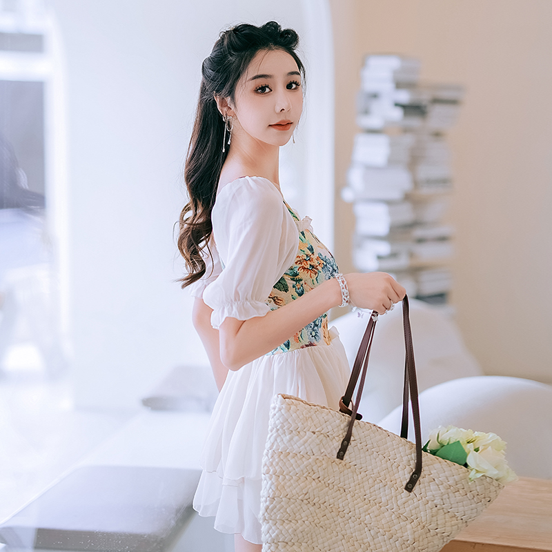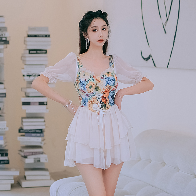 大码泳衣连体裙式微胖女孩纯欲y风泡温泉遮肚显瘦花色吊带胖mm泳