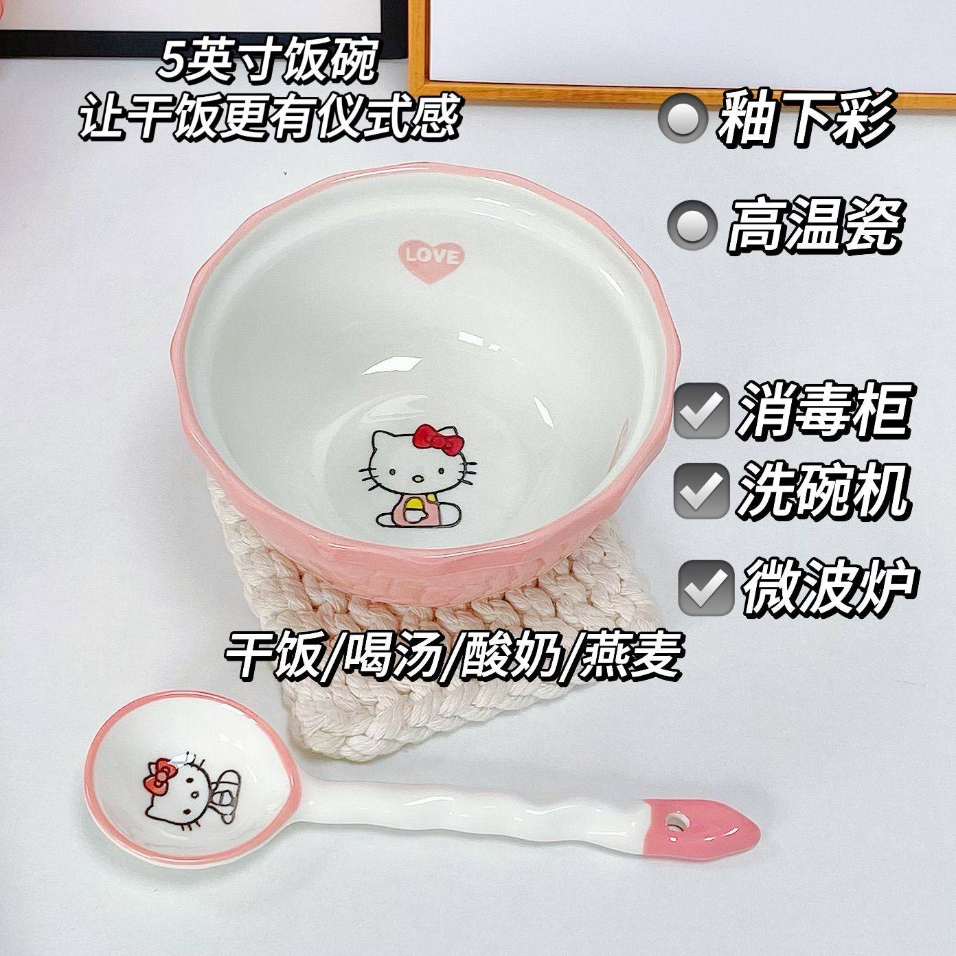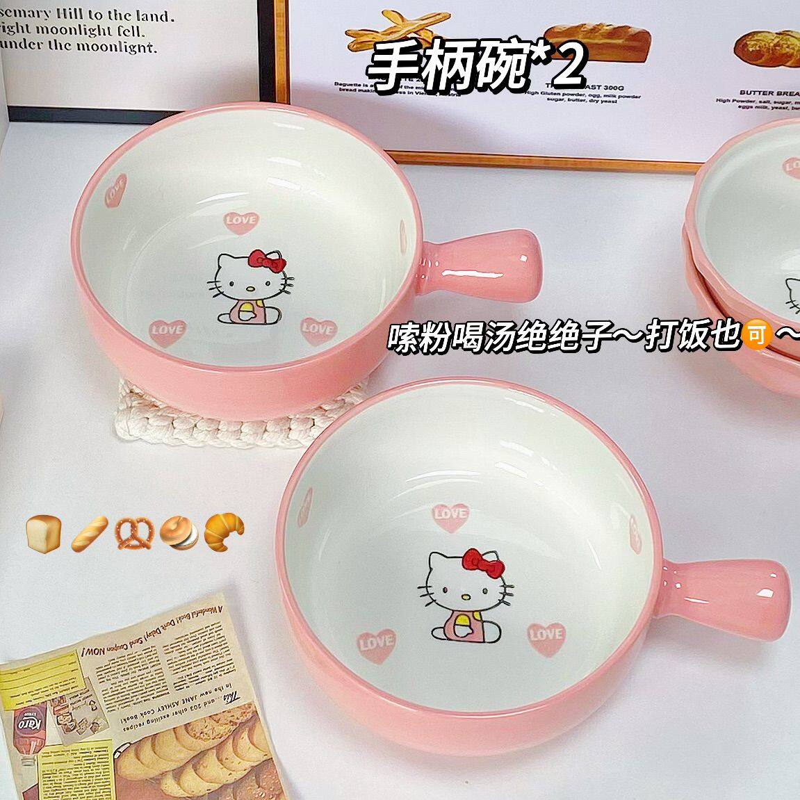 可爱HelloKitty陶瓷手柄碗宿舍学生一人食手把米饭碗家用KT猫餐具