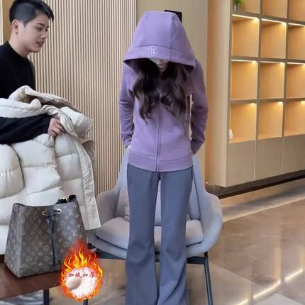 百搭加绒宽松上衣保暖显瘦开衫加厚潮2024女连帽秋冬卫衣外套韩版