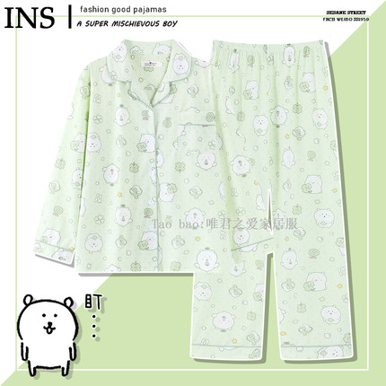 薄荷绿自嘲熊睡衣女款春秋季长袖夏家居服韩版可爱小熊网红风纯棉