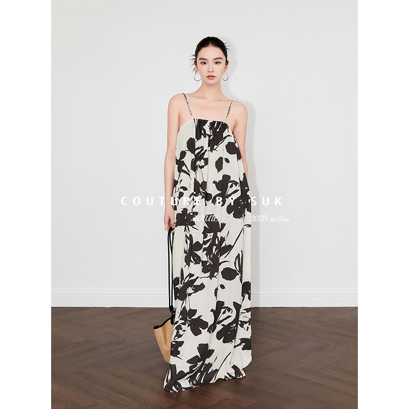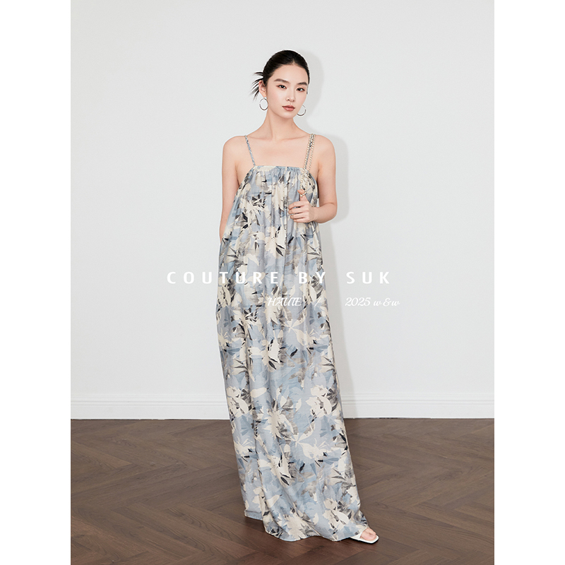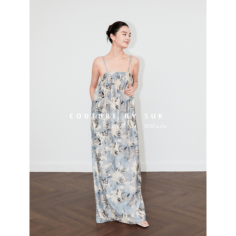 SUK 春山如黛!春夏新品棉麻面料艺术感印花麻花肩带吊带连衣裙女