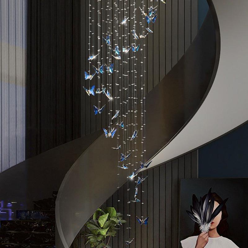 楼梯灯长吊灯彩色水晶蝴蝶现代简约复式楼别墅大厅楼梯井旋转灯具