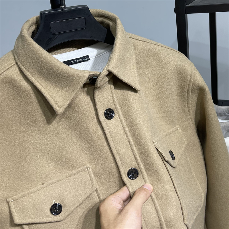 秋冬季仿羊毛双面呢翻领工装衬衫型夹克男宽松版卡其色厚挺外套