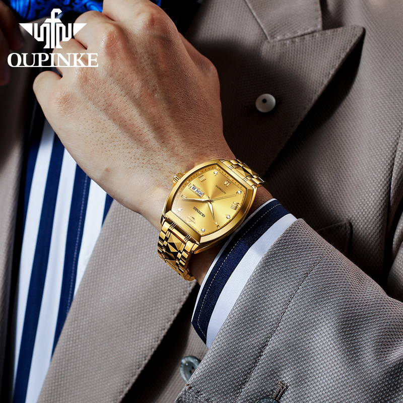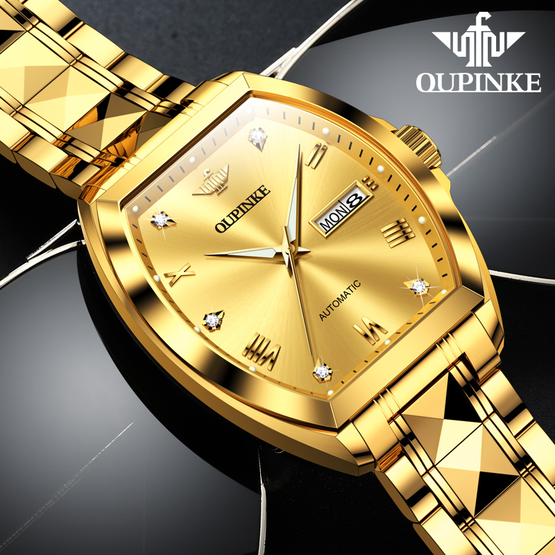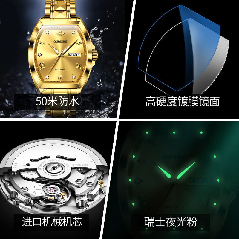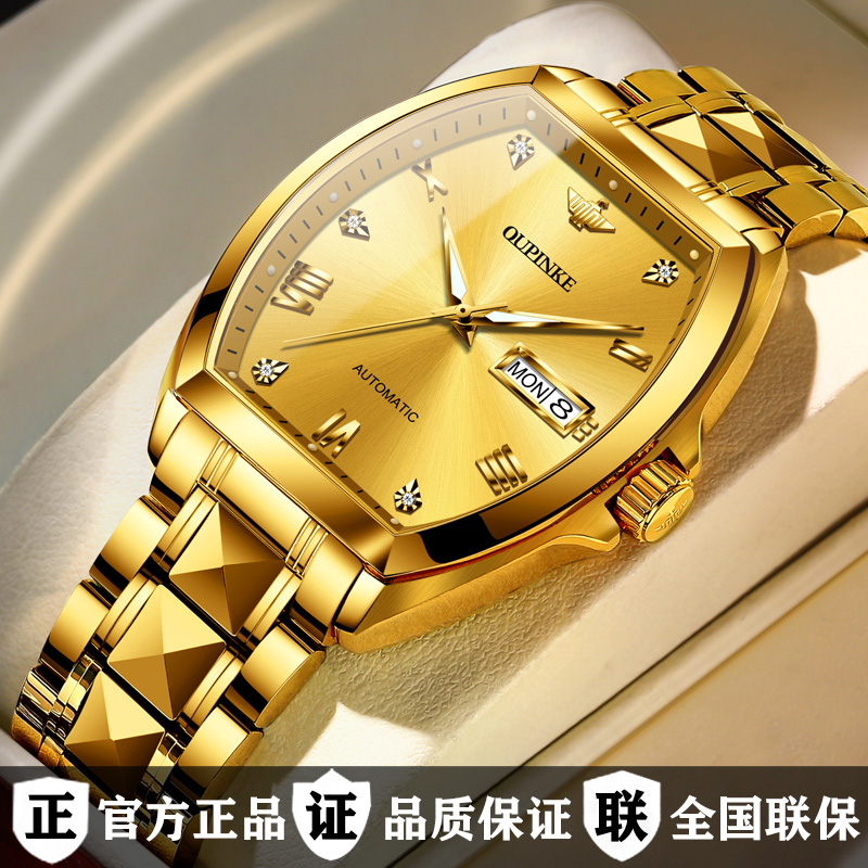 瑞士认证正品牌手表男机械表全自动表18k黄金色进口芯男款酒桶形