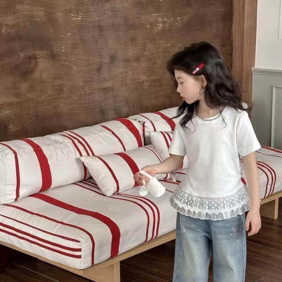 女童夏季蕾丝拼接短袖2025夏装新款小女孩甜美中大儿童时髦t恤潮