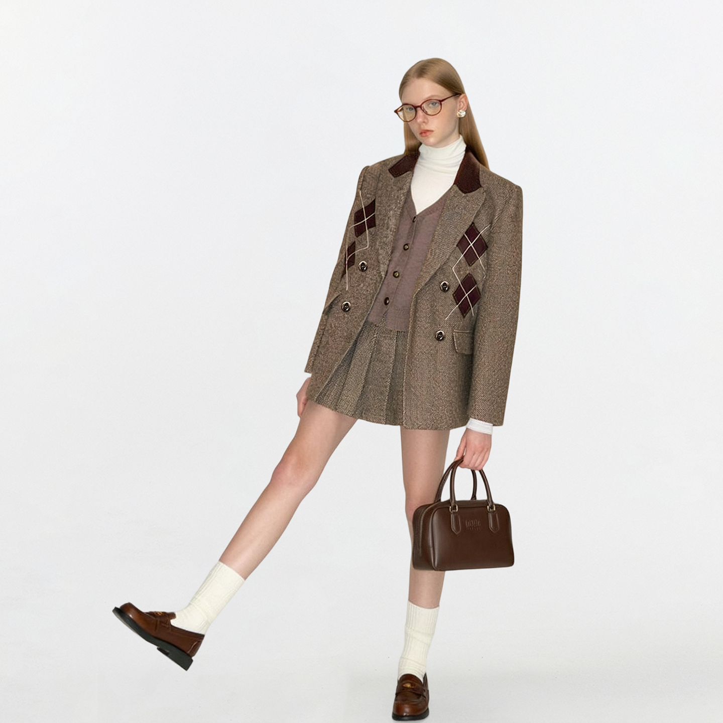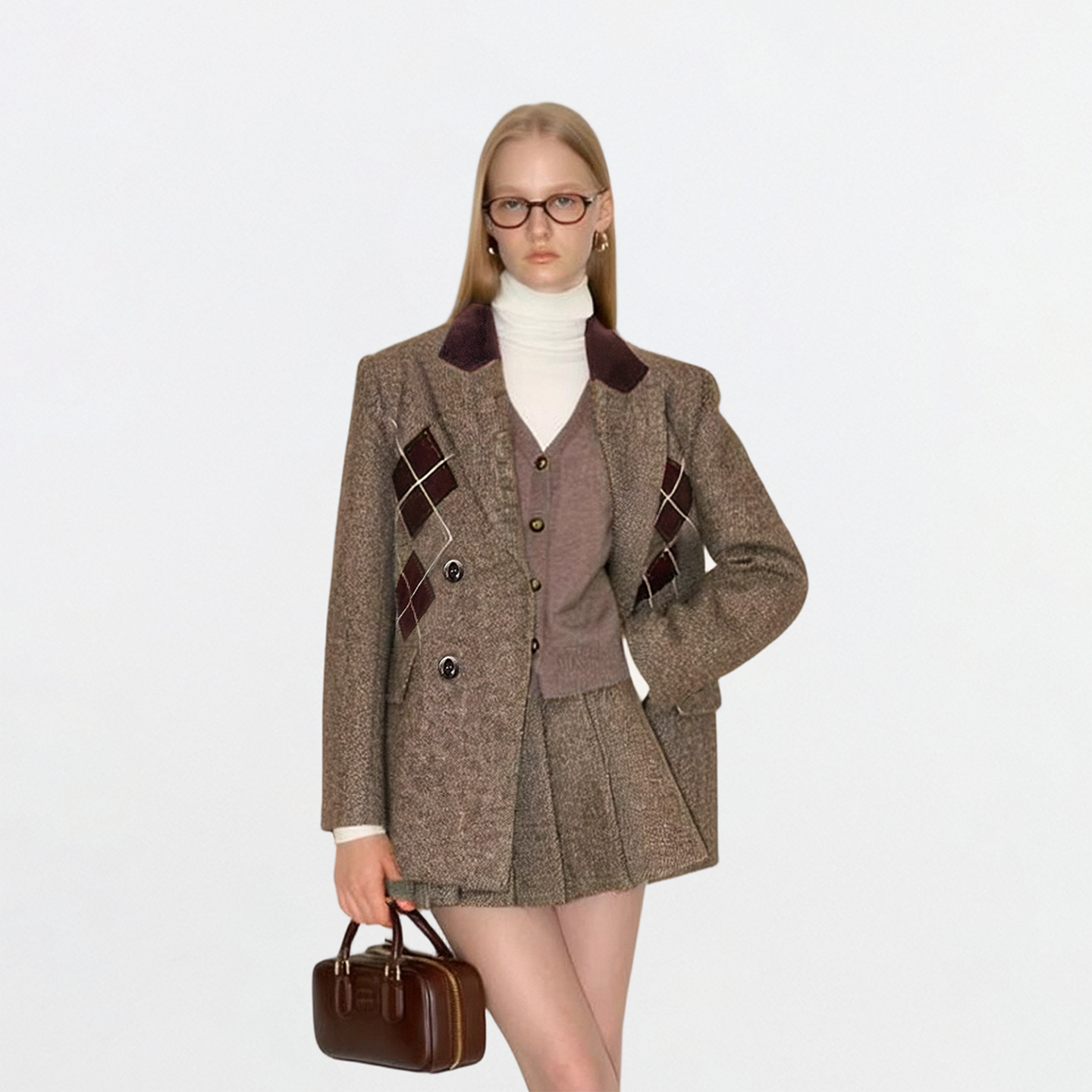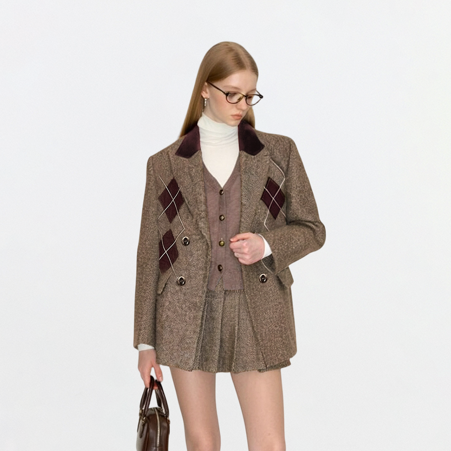 AHMI“英伦留学生”复古高智感菱格纹毛呢西装外套女秋冬时尚套装