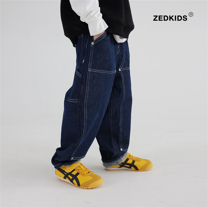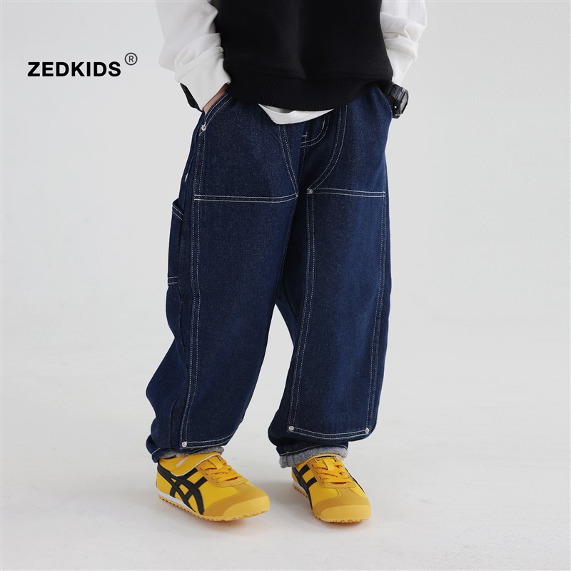 儿童抓绒软牛仔裤秋冬季男女童单宁深牛仔复古宽松牛仔长裤厚裤子