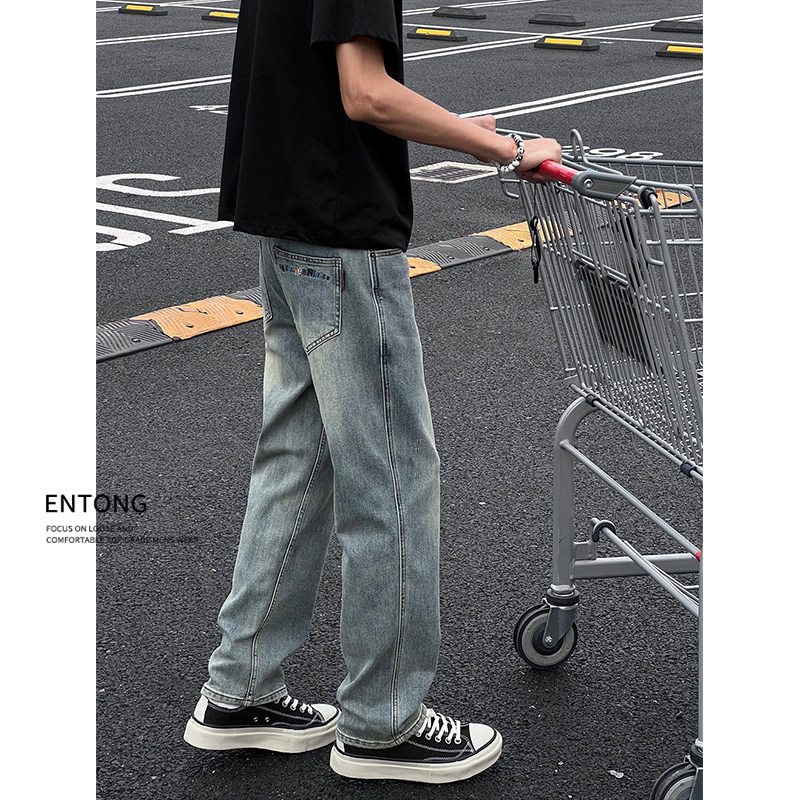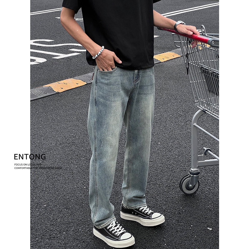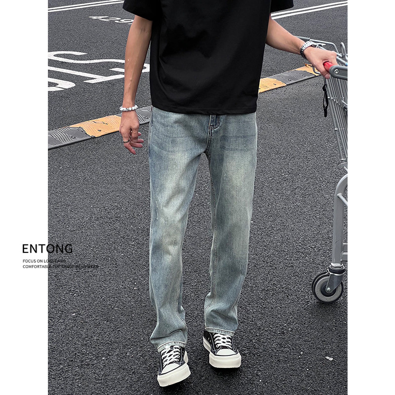 Entong美式复古高级感水洗牛仔裤男生显瘦潮牌修身直筒百搭长裤子