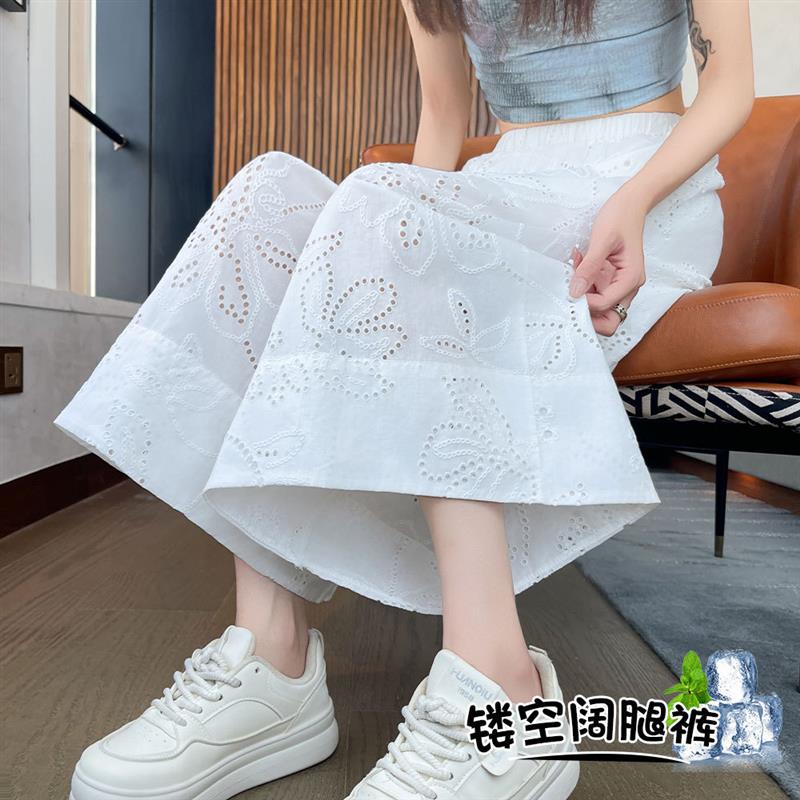 白色蕾丝镂空冰丝阔腿裤女夏薄款透气速干 干空调裤高腰宽松七分