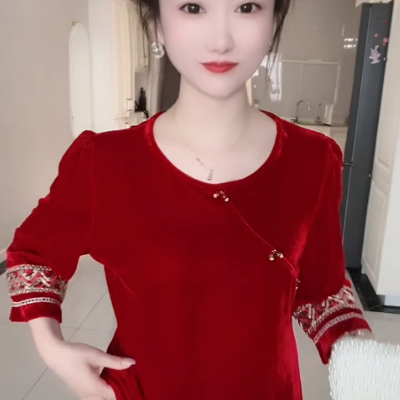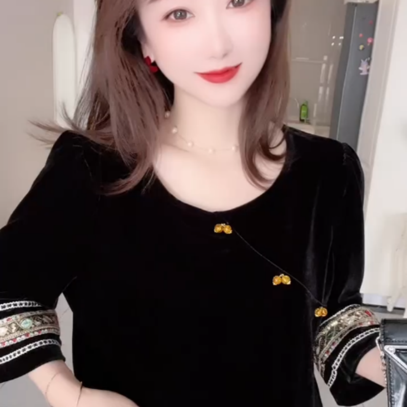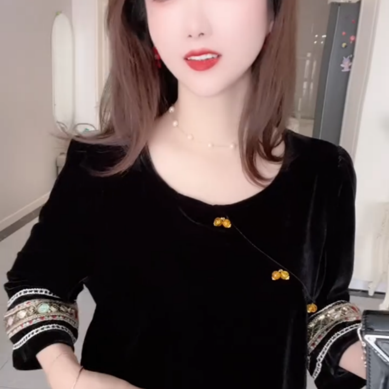 复古国风休闲丝绒女轻熟风穿搭秋款宽松遮肉显瘦长袖金丝绒上衣女