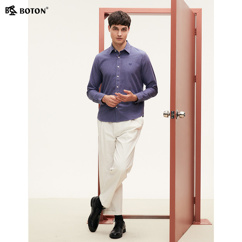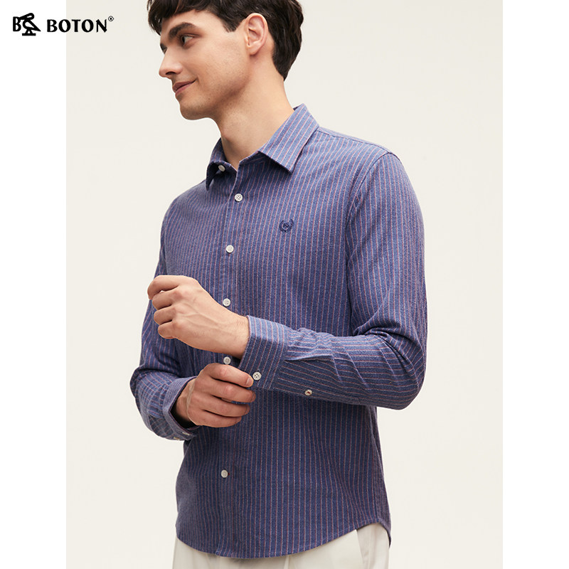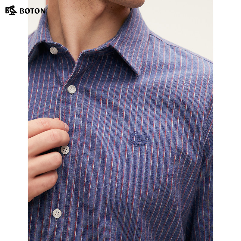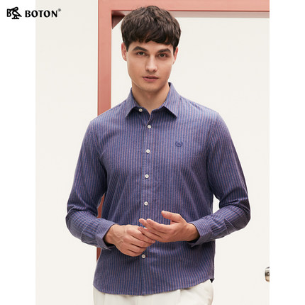 波顿2025秋季新款男蓝红白色长袖条纹衬衫高端休闲美式英伦风衬衣