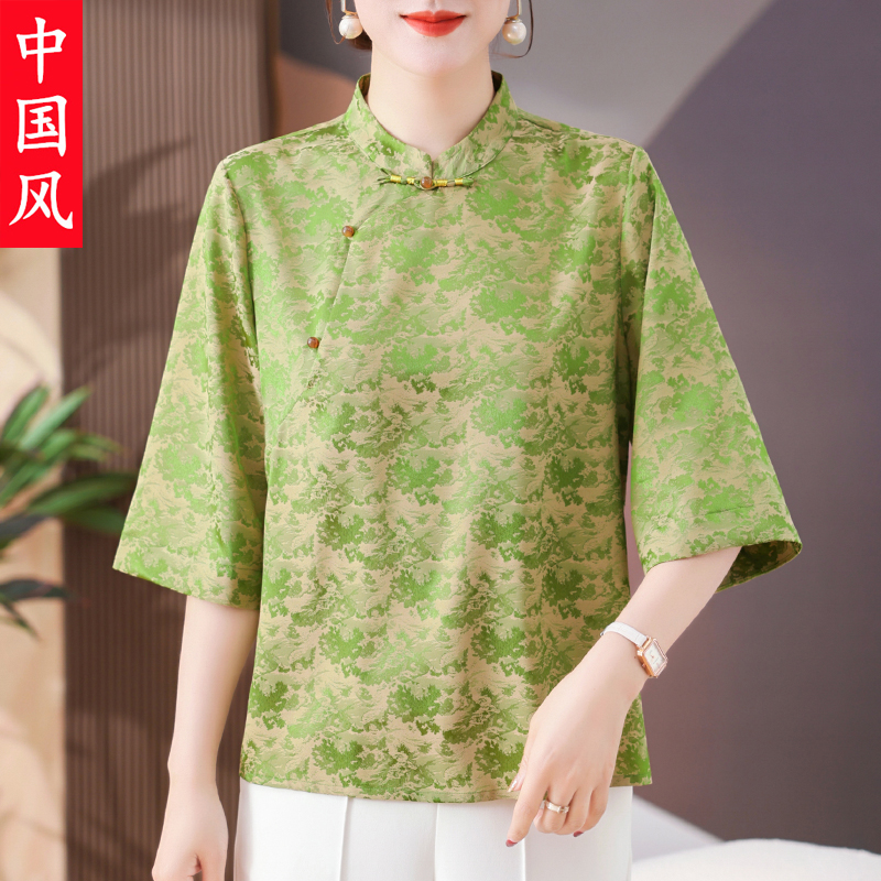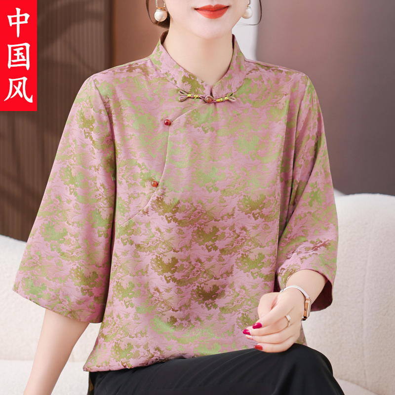 妈妈夏装真丝盘扣上衣加肥加大码新中式国风中老年女装桑蚕丝t恤