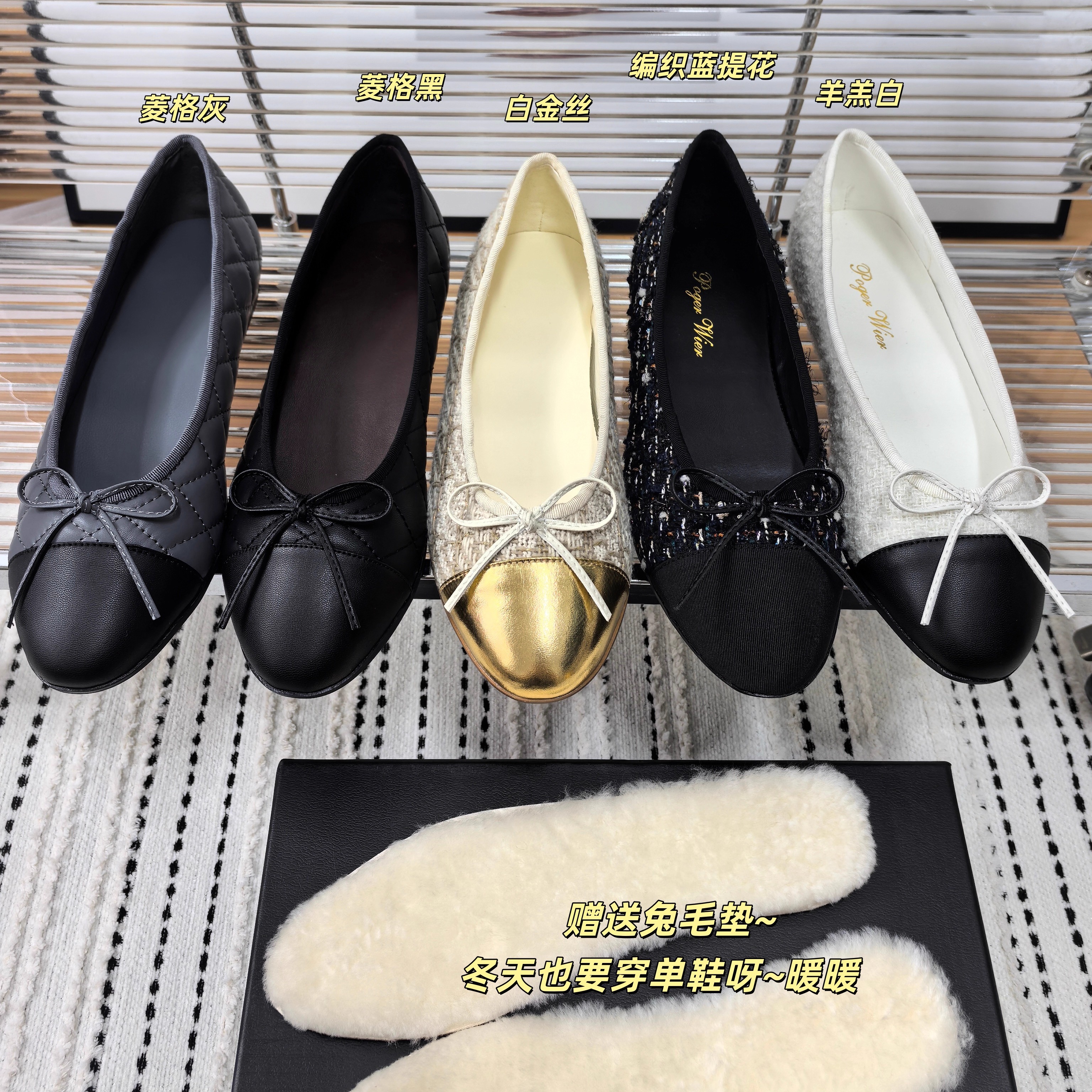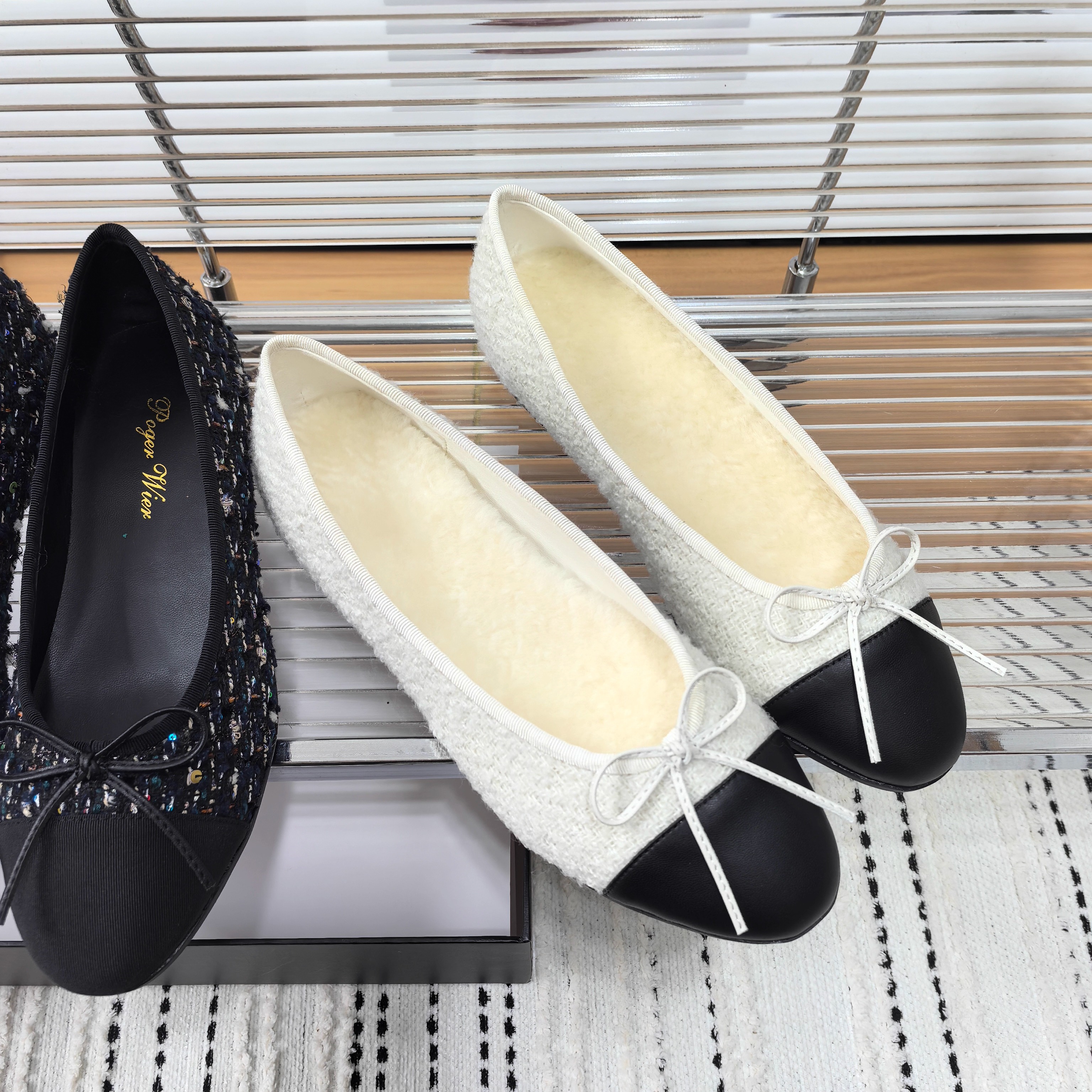 真皮羊毛小香风亮片蝴蝶结平底鞋加绒保暖芭蕾舞鞋圆头浅口单鞋女