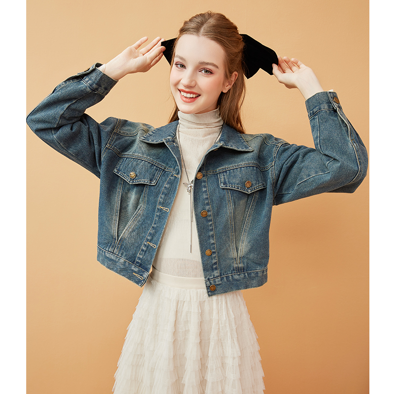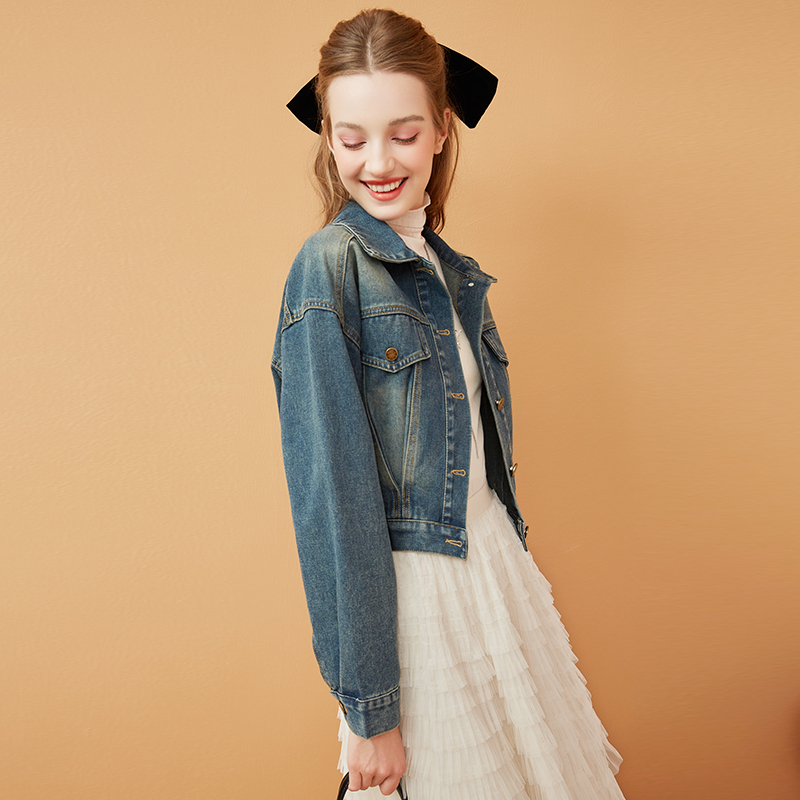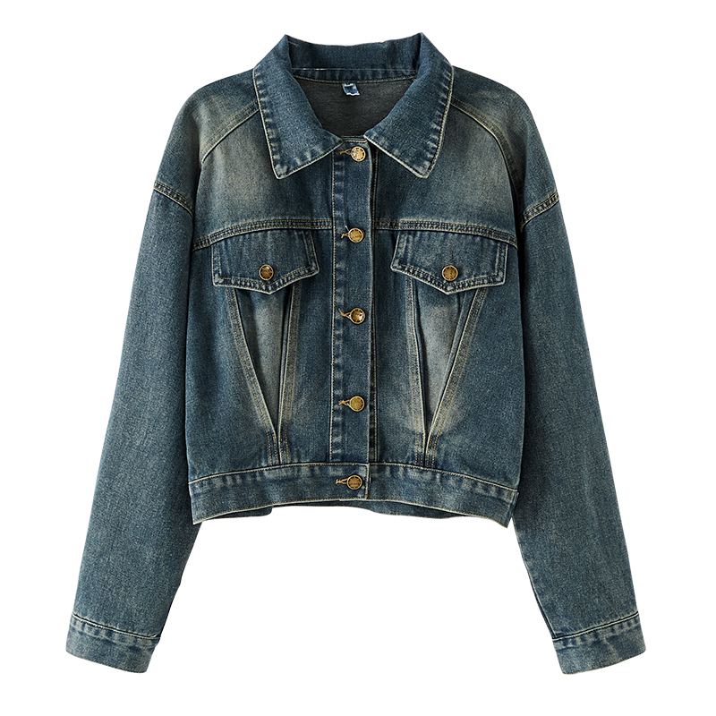 休闲复古水洗翻领牛仔外套女204春秋新款时尚小个子夹克短款上衣