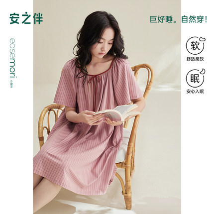 安之伴睡裙女夏季纯棉短袖薄款休闲条纹甜美宽松睡衣中长款家居服