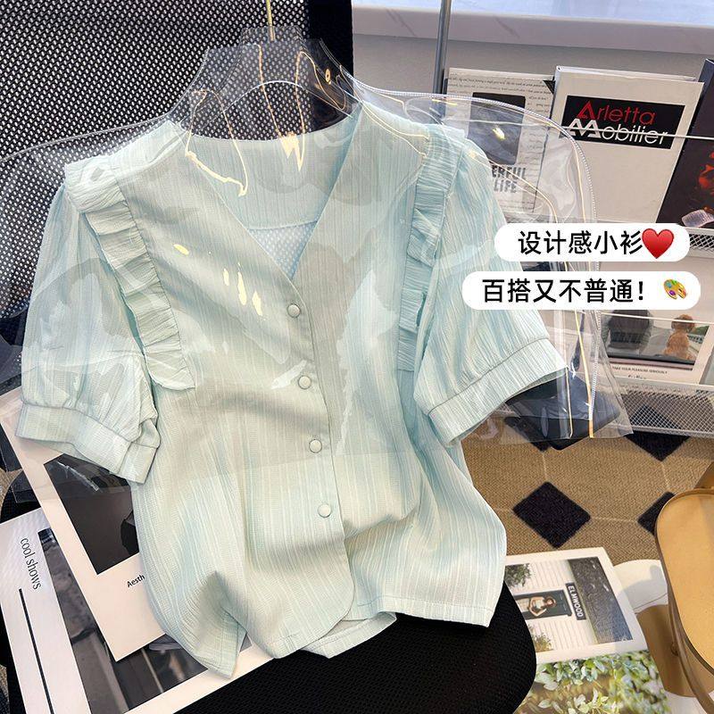 雪纺白色衬衫女夏季韩版百搭上衣女短袖小众宽松遮肉开衫v领t恤潮