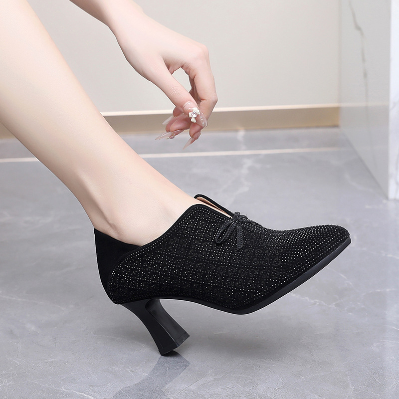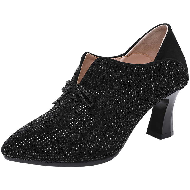 磨砂烫钻网纱单鞋女2024春夏季新款粗跟高跟尖头小码31码女鞋