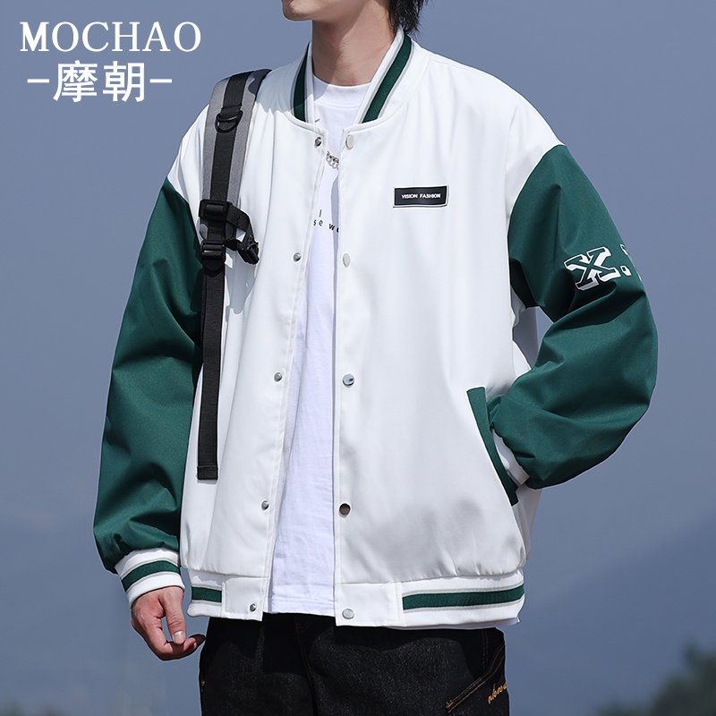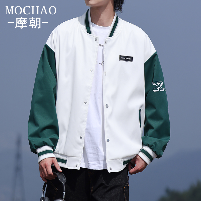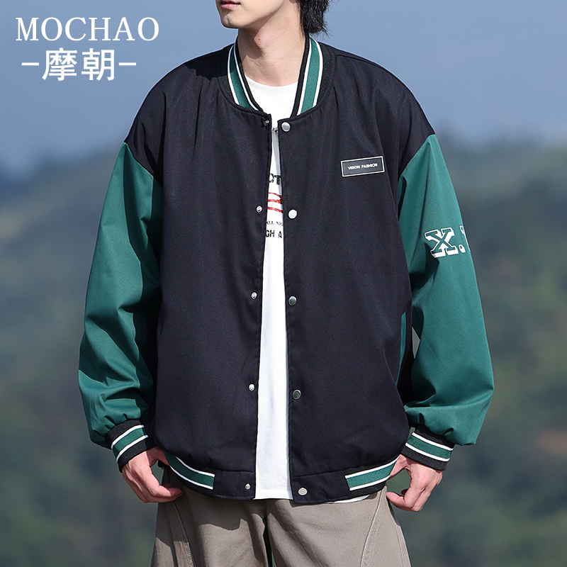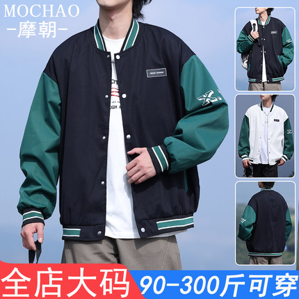 摩朝美式潮牌大码夹克男秋冬新款休闲时尚宽松拼色工装棒球领外套