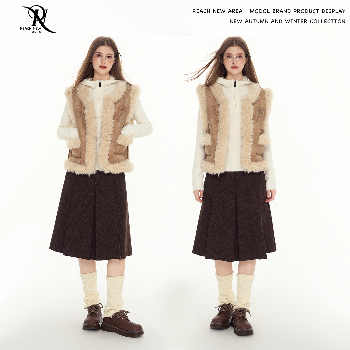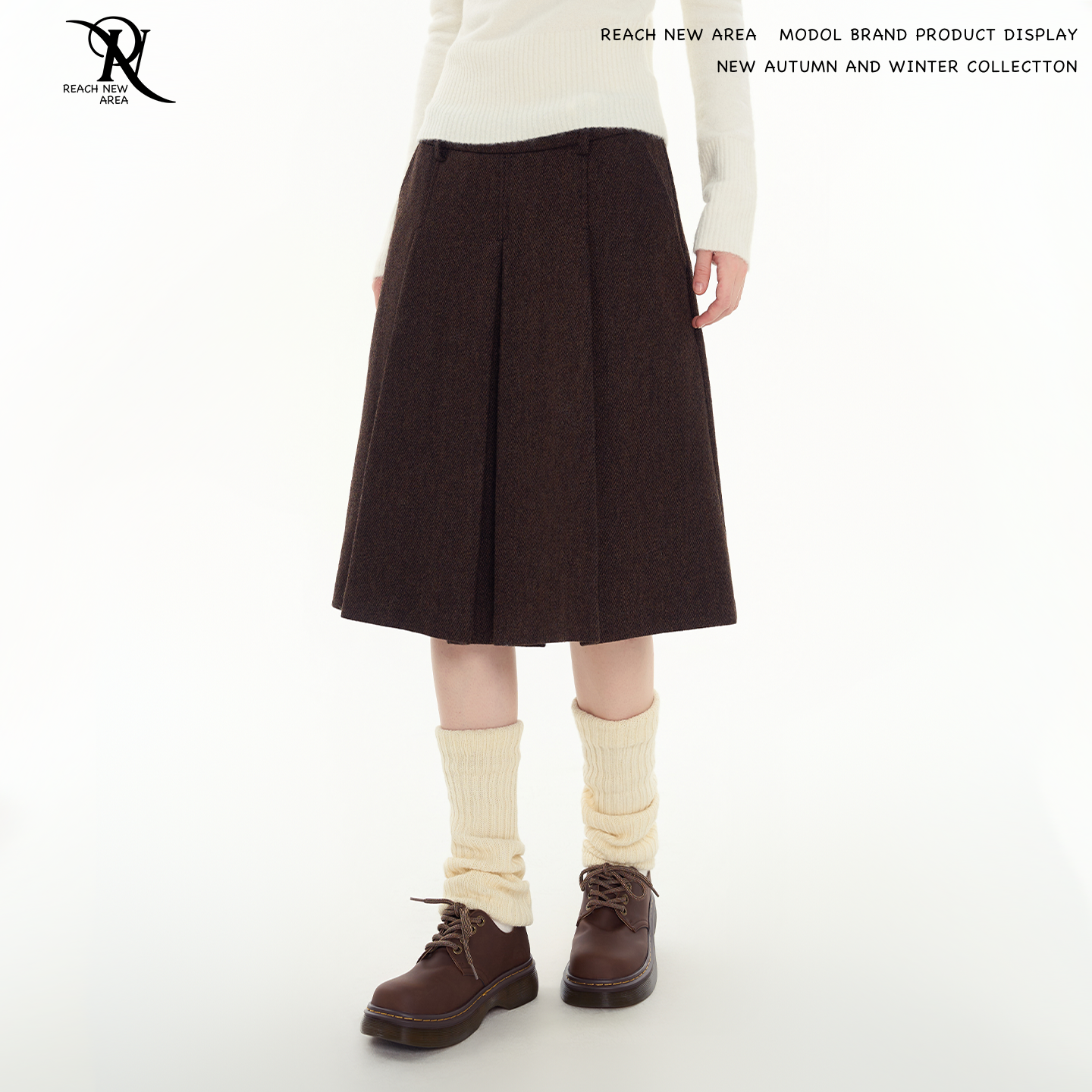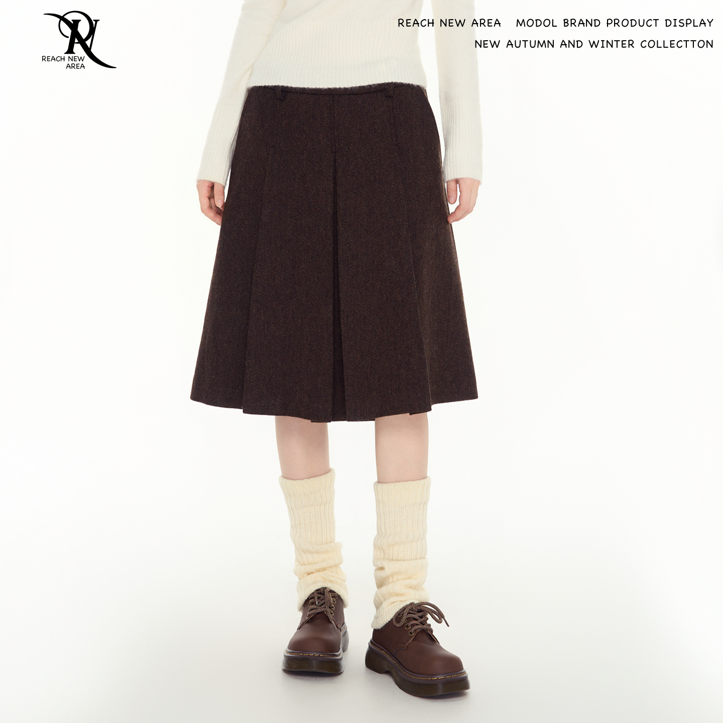 REACH秋冬新款A字型半身裙女毛呢面料高级感修身显瘦百褶裙中长款