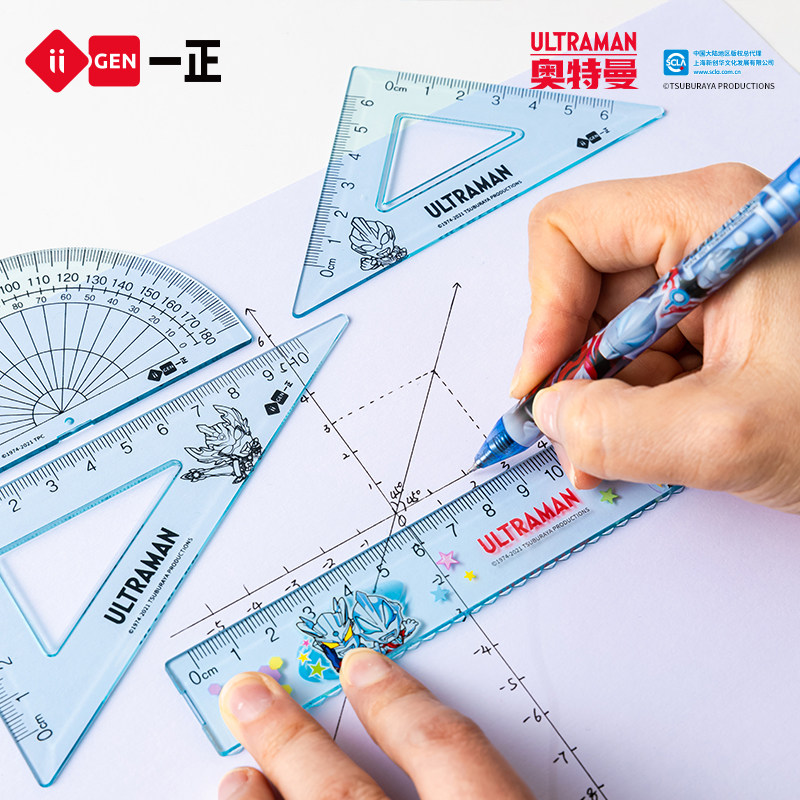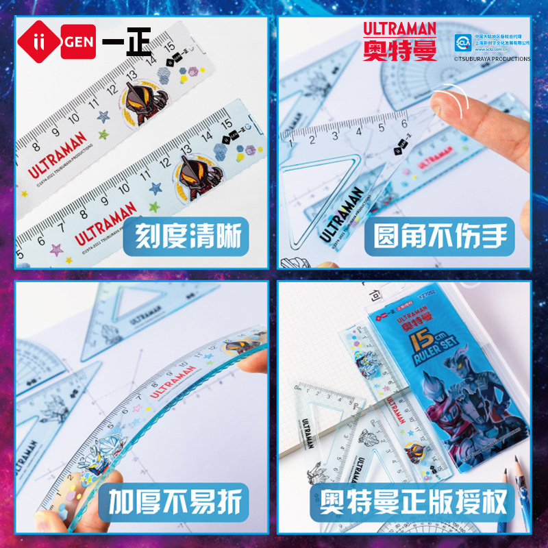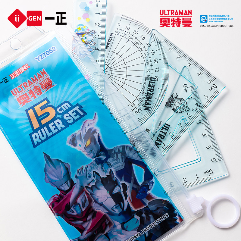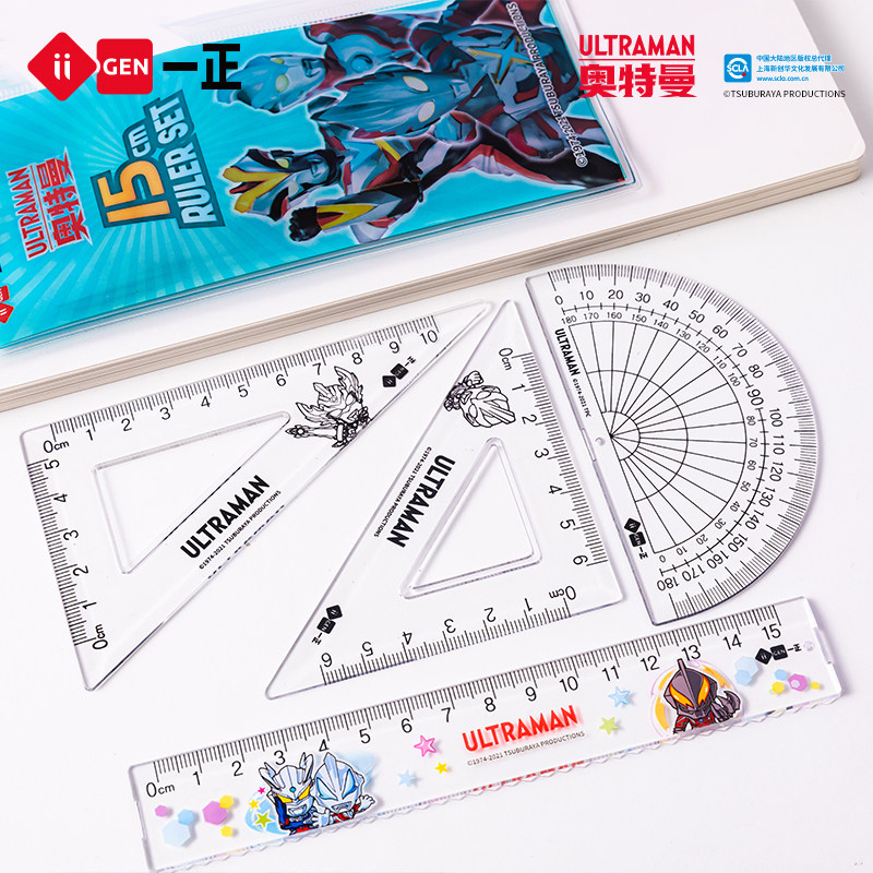 iiGEN一正学生文具正版赛罗奥特曼学生四件套套尺15cm直尺 小学生三角尺量角器男生学习文具卡通版奥特曼尺子