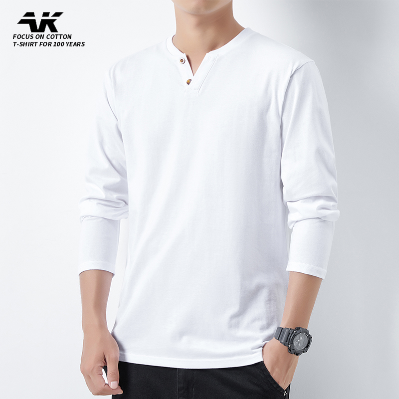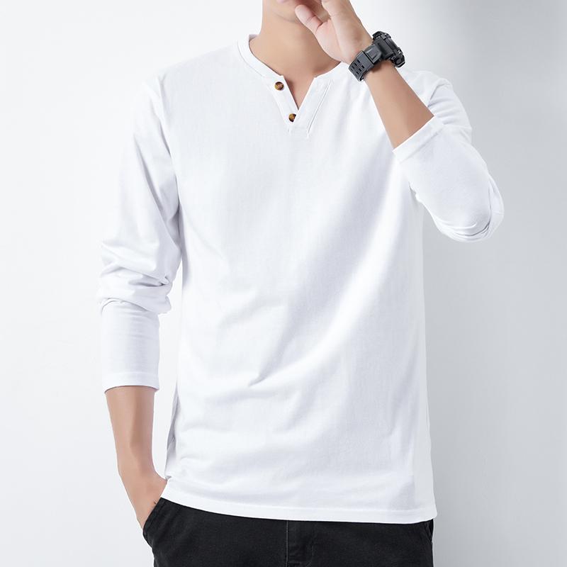 V领扣子纯棉秋季宽松型男士长袖T恤打底衫上衣服加绒潮流男装秋衣