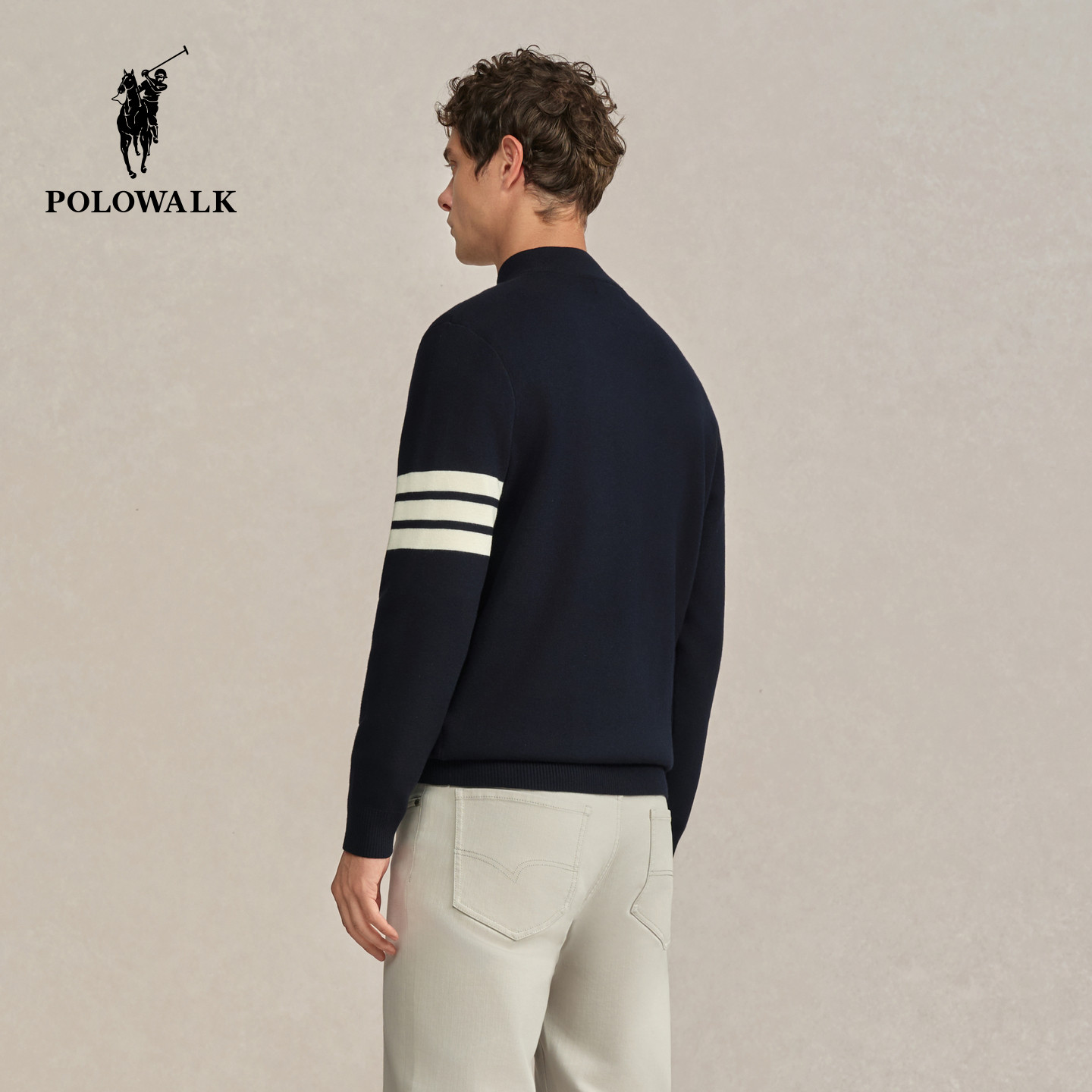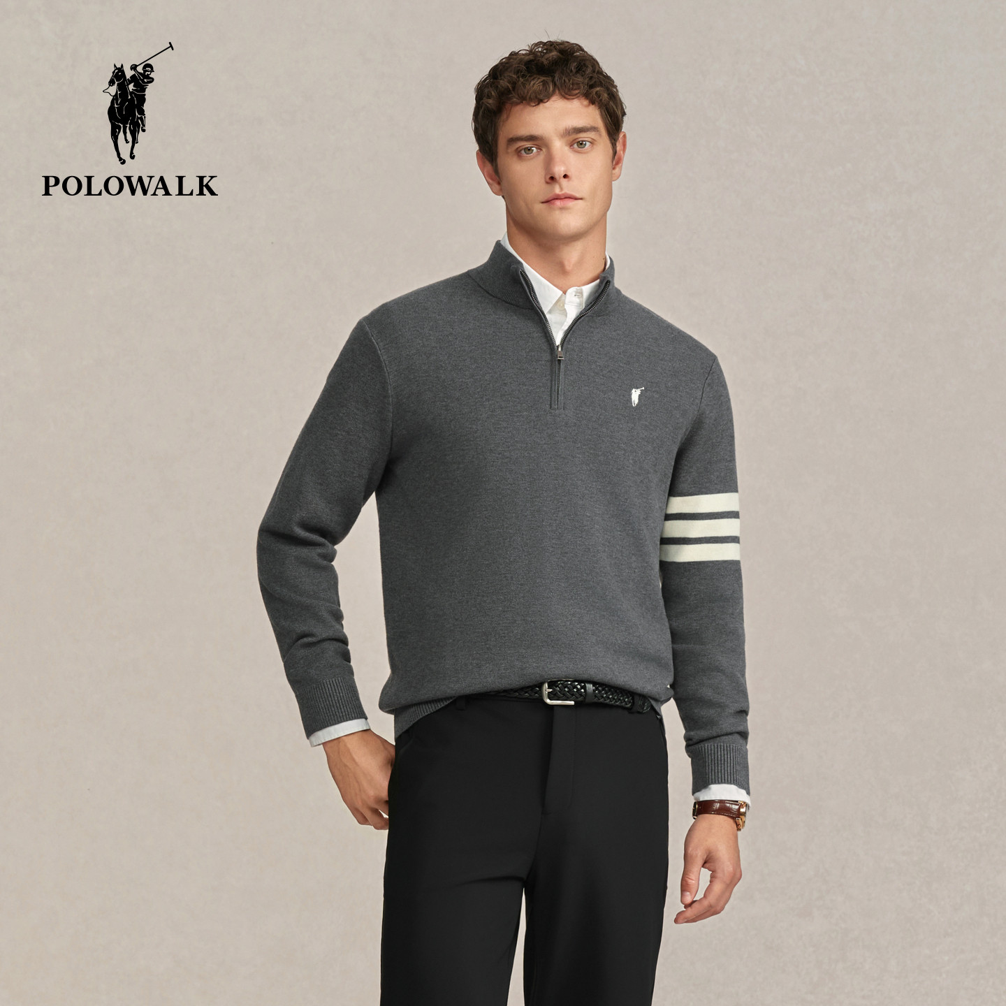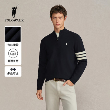 POLOWALK男式针织衫2025冬季新品时尚挺括半拉链立领条纹加绒上衣