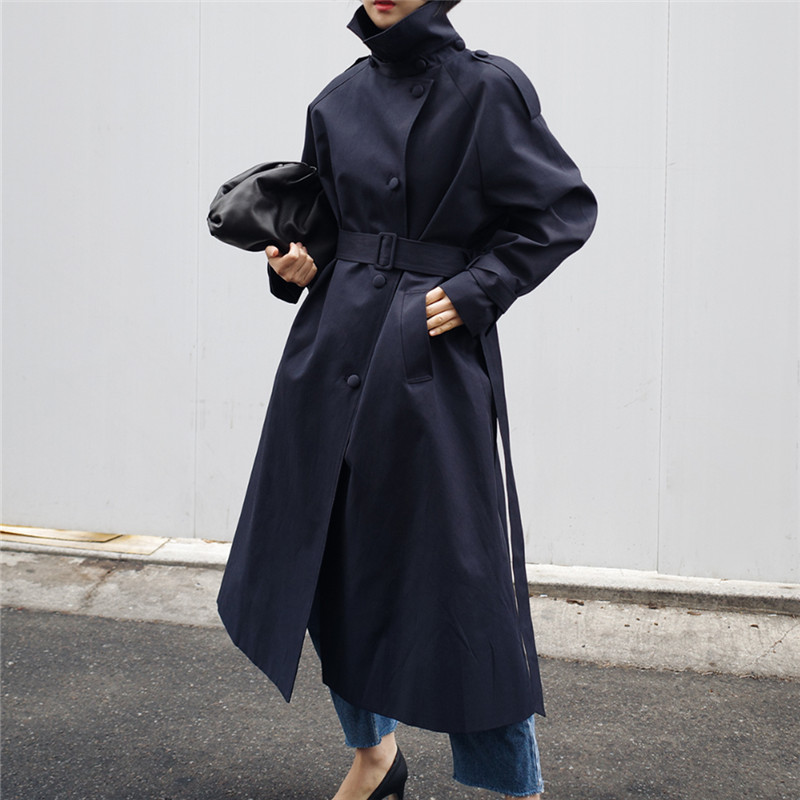 纯诗曼风衣女中长款韩版秋装新款立领修身收腰长袖系带女士外套潮
