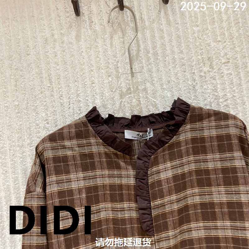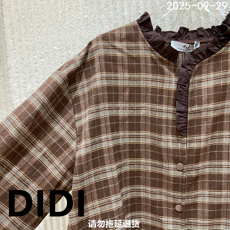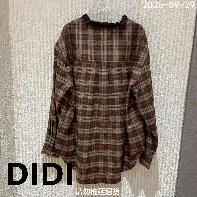 欧洲站2025秋季新款拼色木耳边纽扣复古格纹休闲长袖衬衫女6225