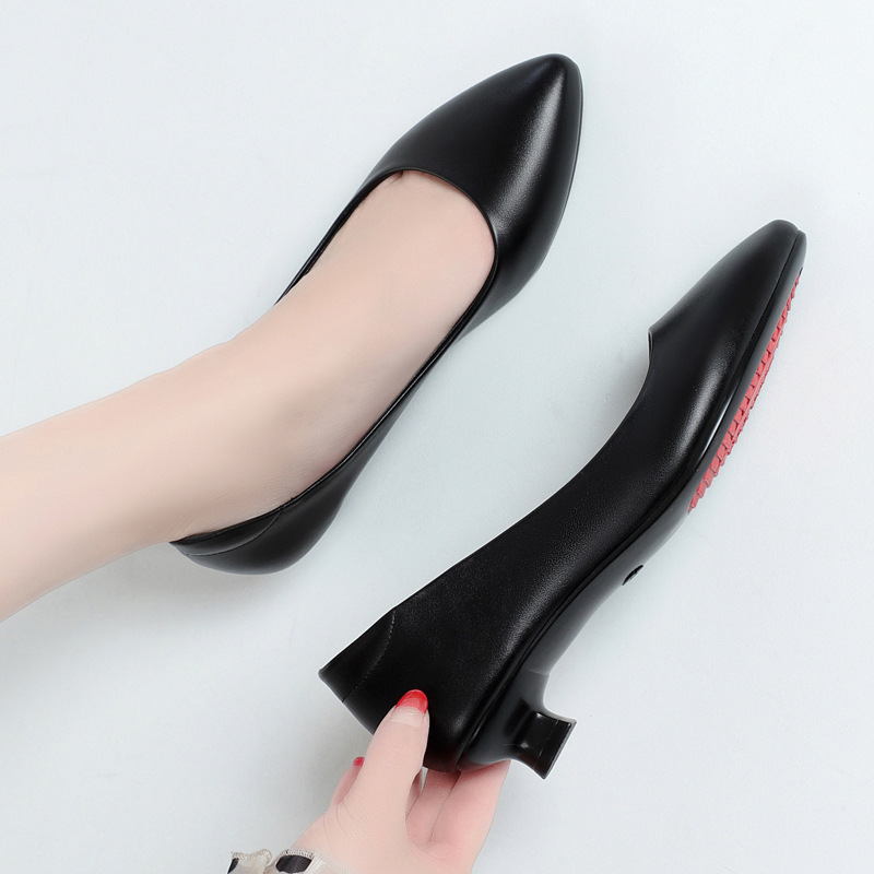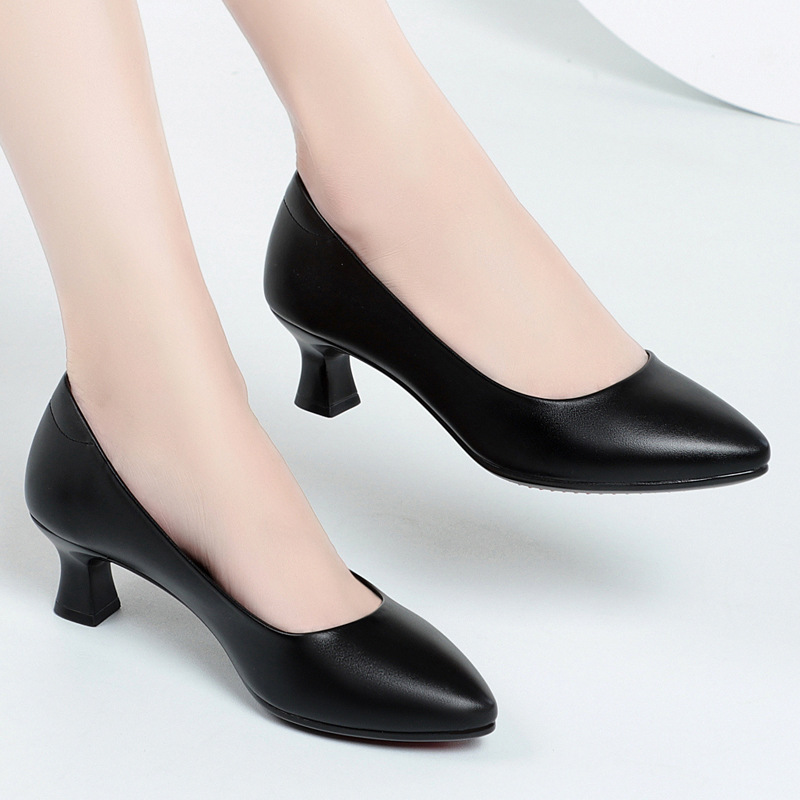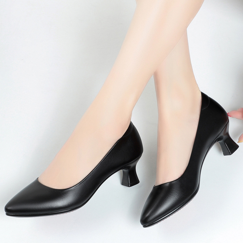 春秋空姐久站真皮软底工作鞋女黑色中跟粗跟舒适皮鞋上班职业