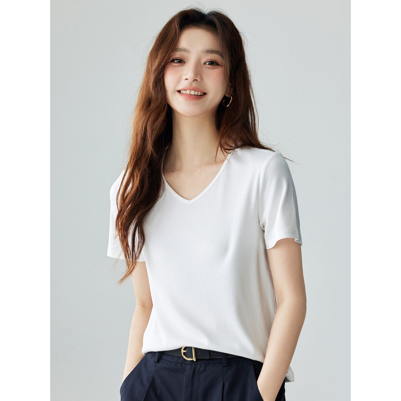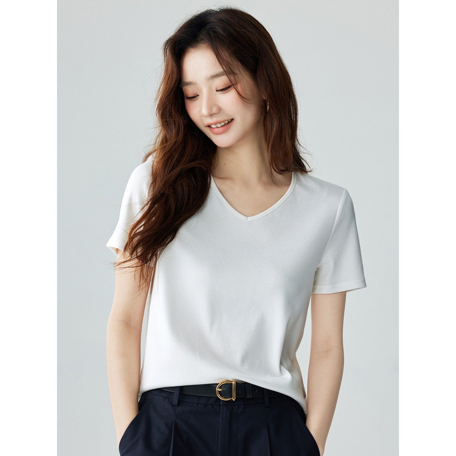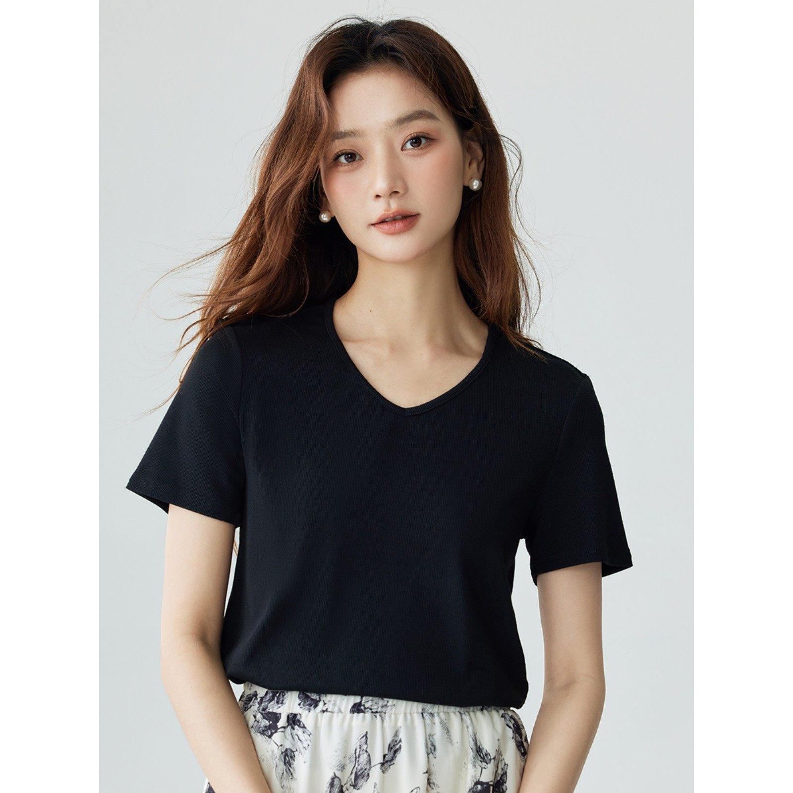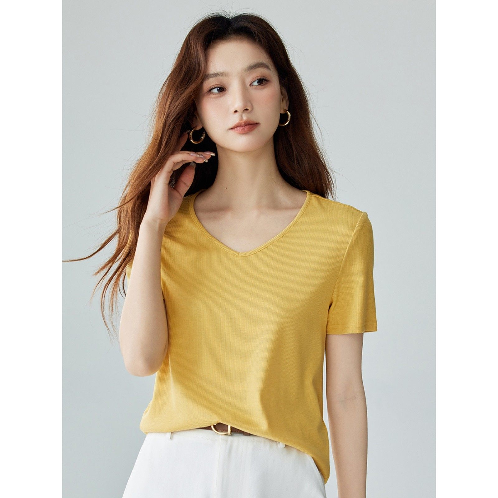 茵曼气质基础纯色T恤女2024夏季百搭显瘦舒适休闲V领短袖上衣
