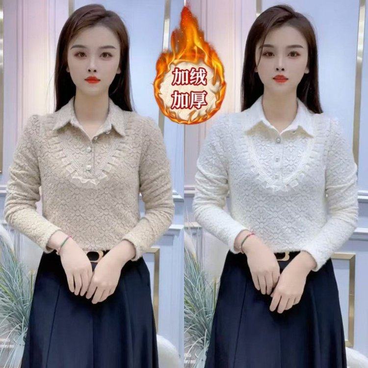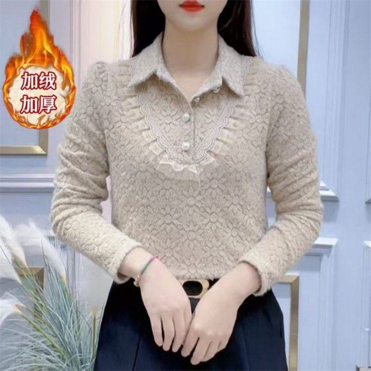 2025秋冬季新款时尚蕾丝衬衫领加绒上衣减龄妈妈加厚保暖洋气小衫