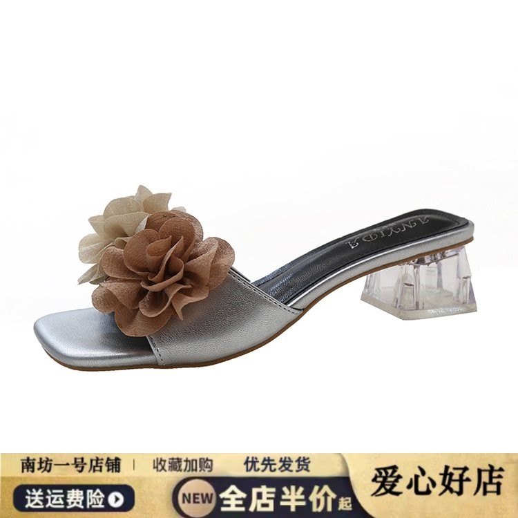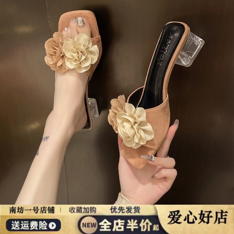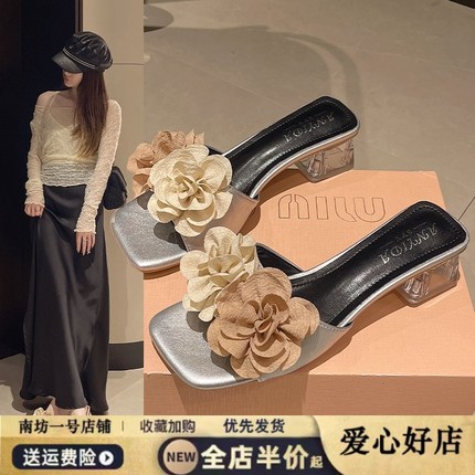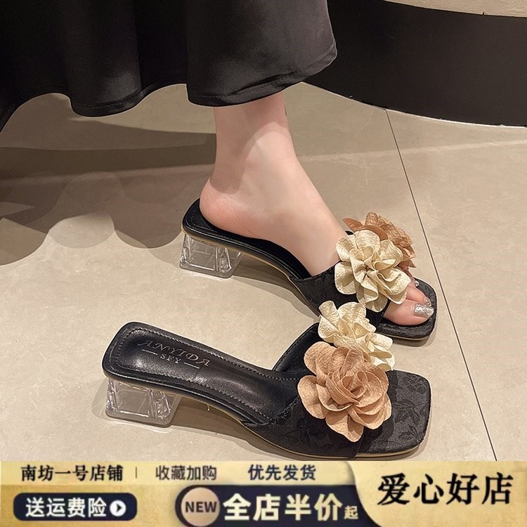 仙女风高跟凉拖鞋女夏季外穿2025新款法式晚风花朵水晶粗跟一字拖