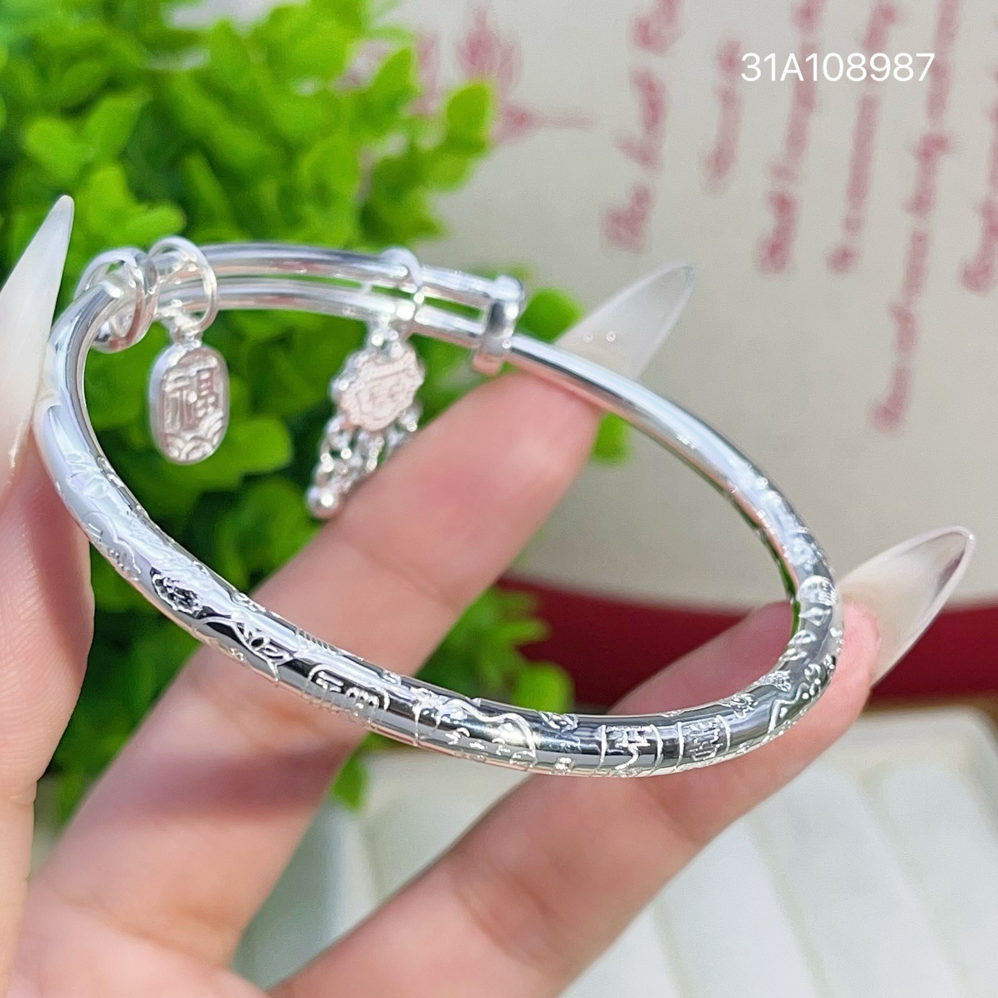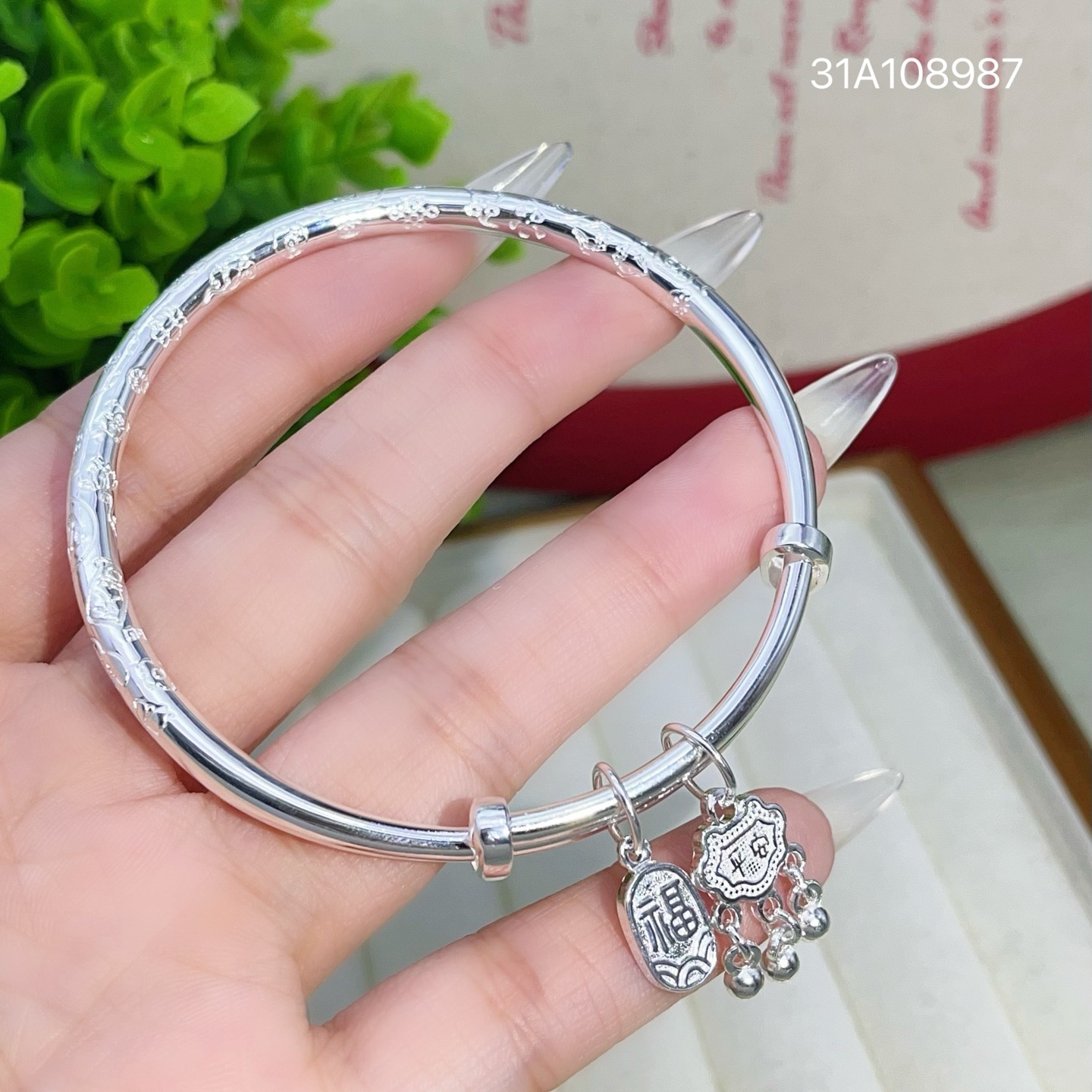 9999纯银手镯女福牌平安锁铃铛吉言实心推拉手环时尚百搭精致手饰