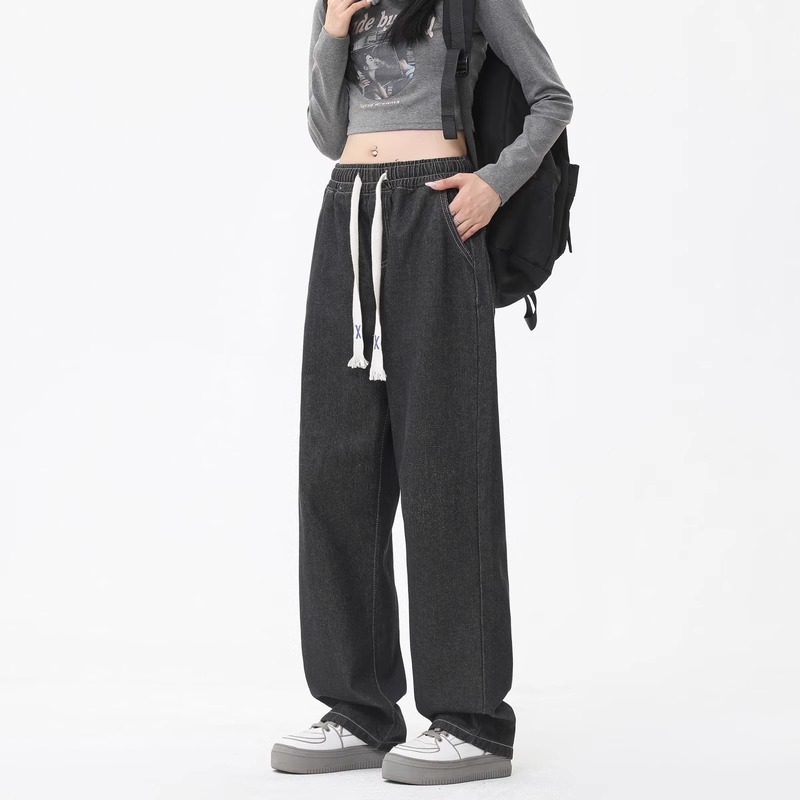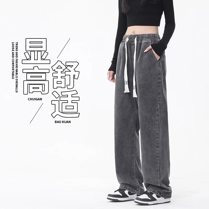 小个子灰色抽绳牛仔裤女松紧腰显瘦休闲宽松阔腿直筒慵懒风裤子秋