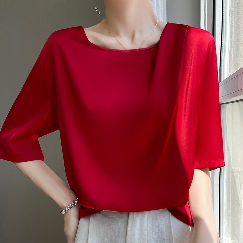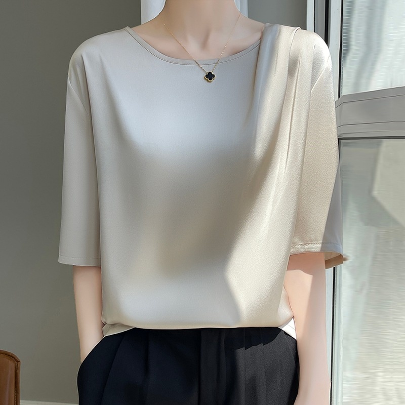 醋酸缎面垂感真丝短袖T恤女夏季休闲宽松显瘦半袖桑蚕丝上衣潮