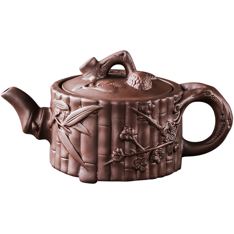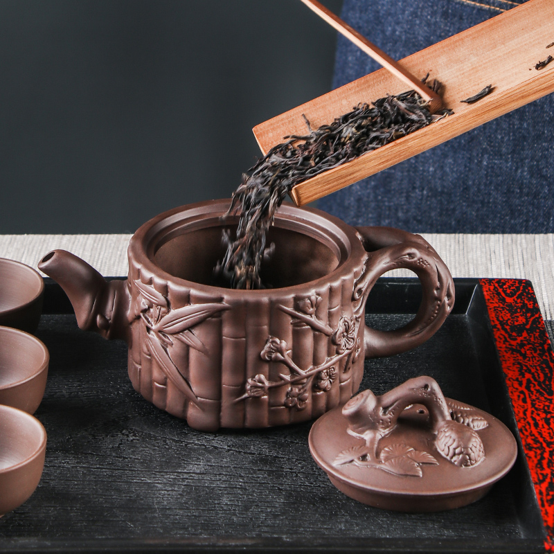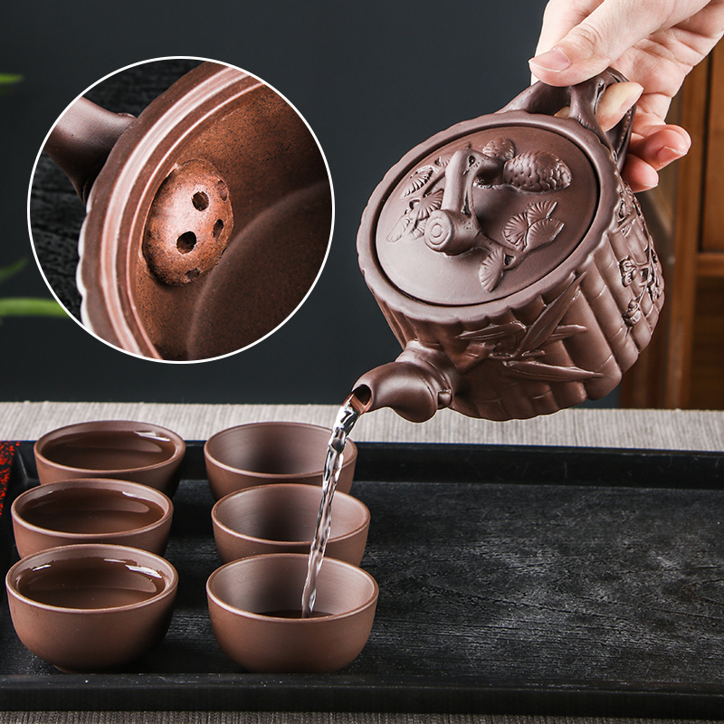 紫砂壶大容量宽口三友壶朱泥手工浮雕茶壶泡茶器功夫茶具茶杯套装