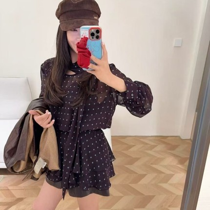 欧洲站2025秋冬新款 设计师款小众复古甜辣飘带波点打底连衣裙女