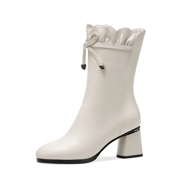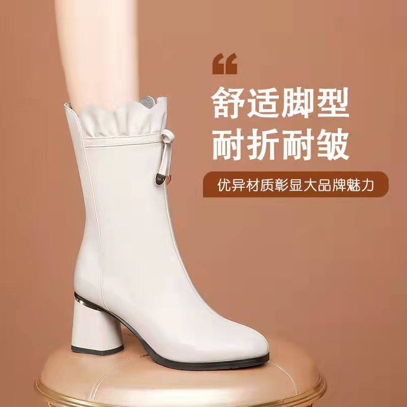 真皮靴子粗跟白色马丁靴2025秋冬新款高跟圆头中筒靴时尚百搭女鞋