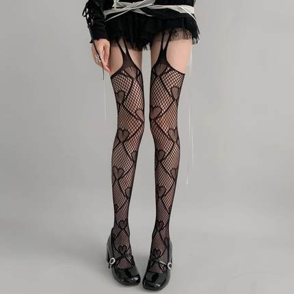 长筒过膝一体式吊带袜蕾丝提花爱心渔网潮流防勾丝性感辣妹春秋季