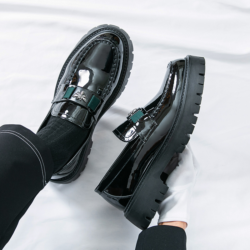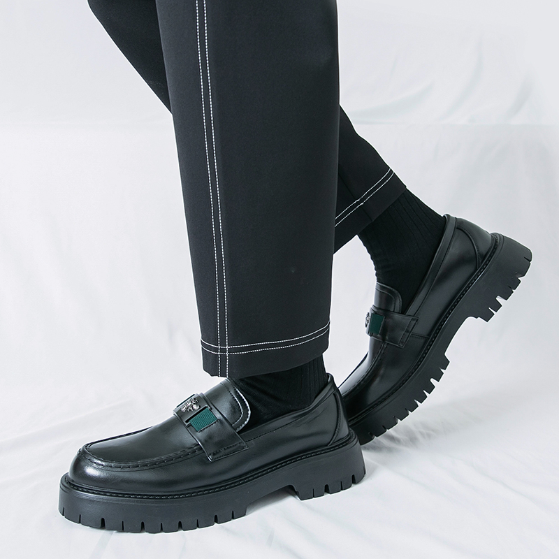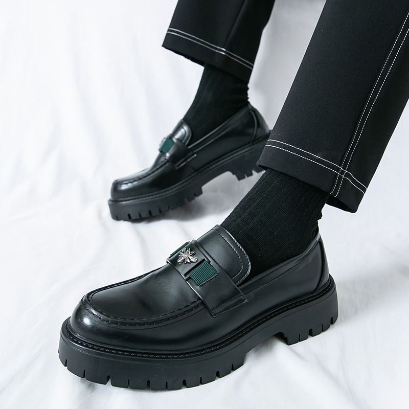 小蜜蜂乐福皮鞋男士秋冬英伦尖头正装休闲发型师厚底增高一脚蹬潮