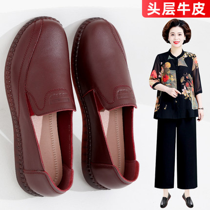 软皮牛筋底妈妈鞋真皮软底春秋款女式单鞋平底圆头防滑中老年皮鞋
