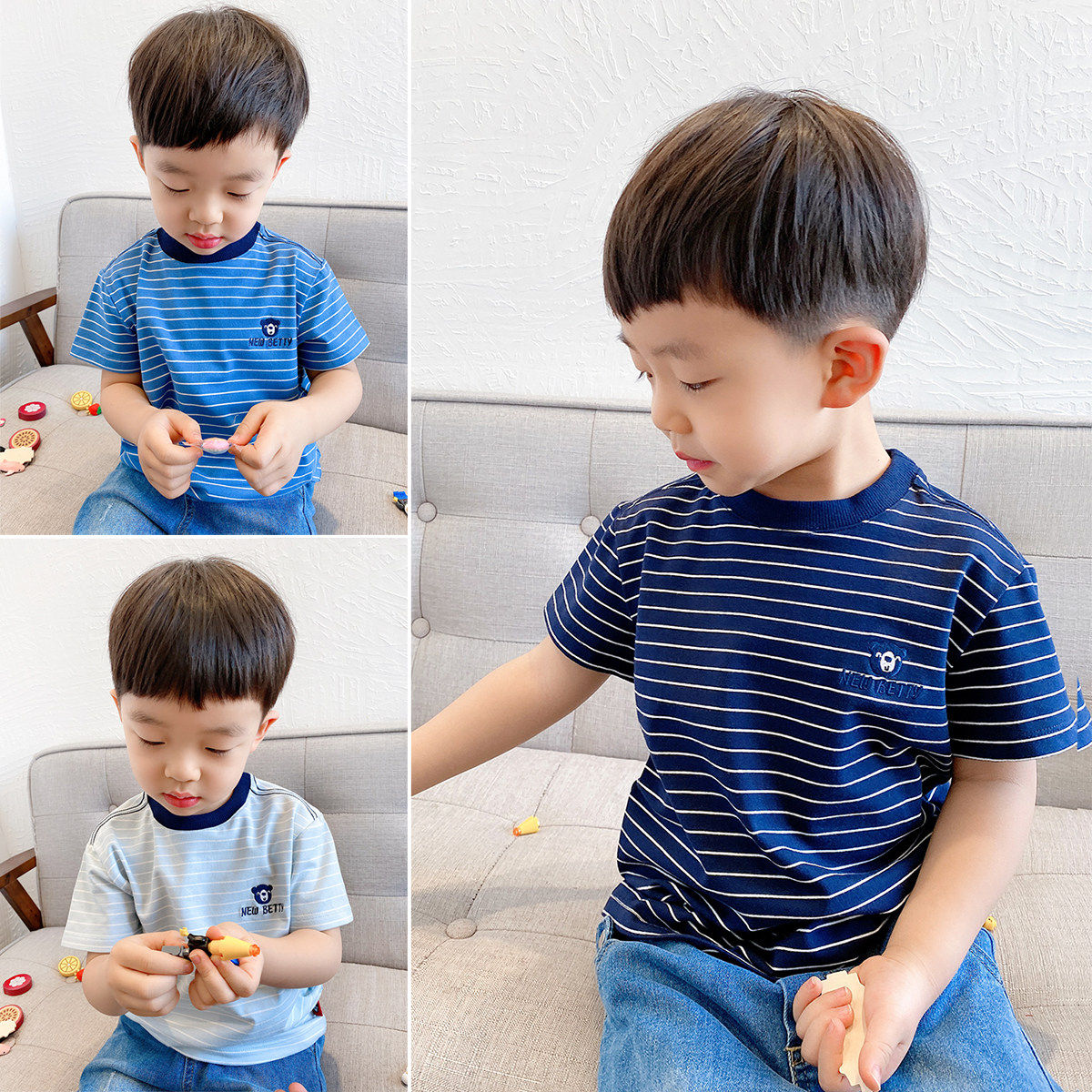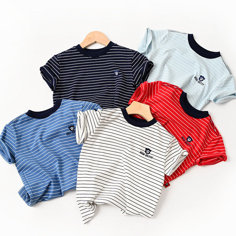 夏日条纹男童女童圆领卡通棉T恤
